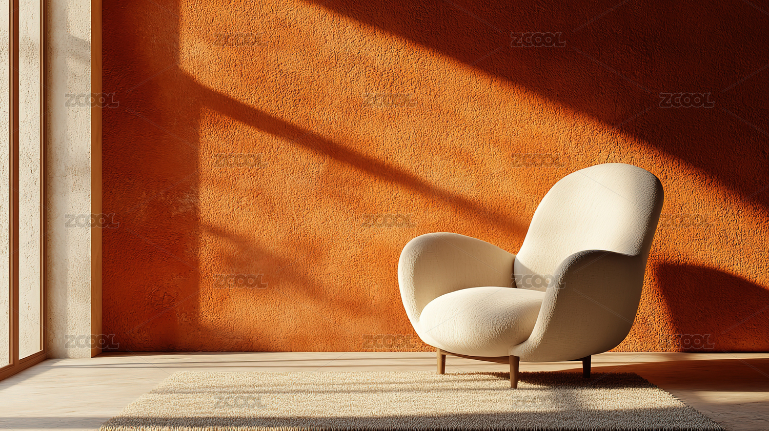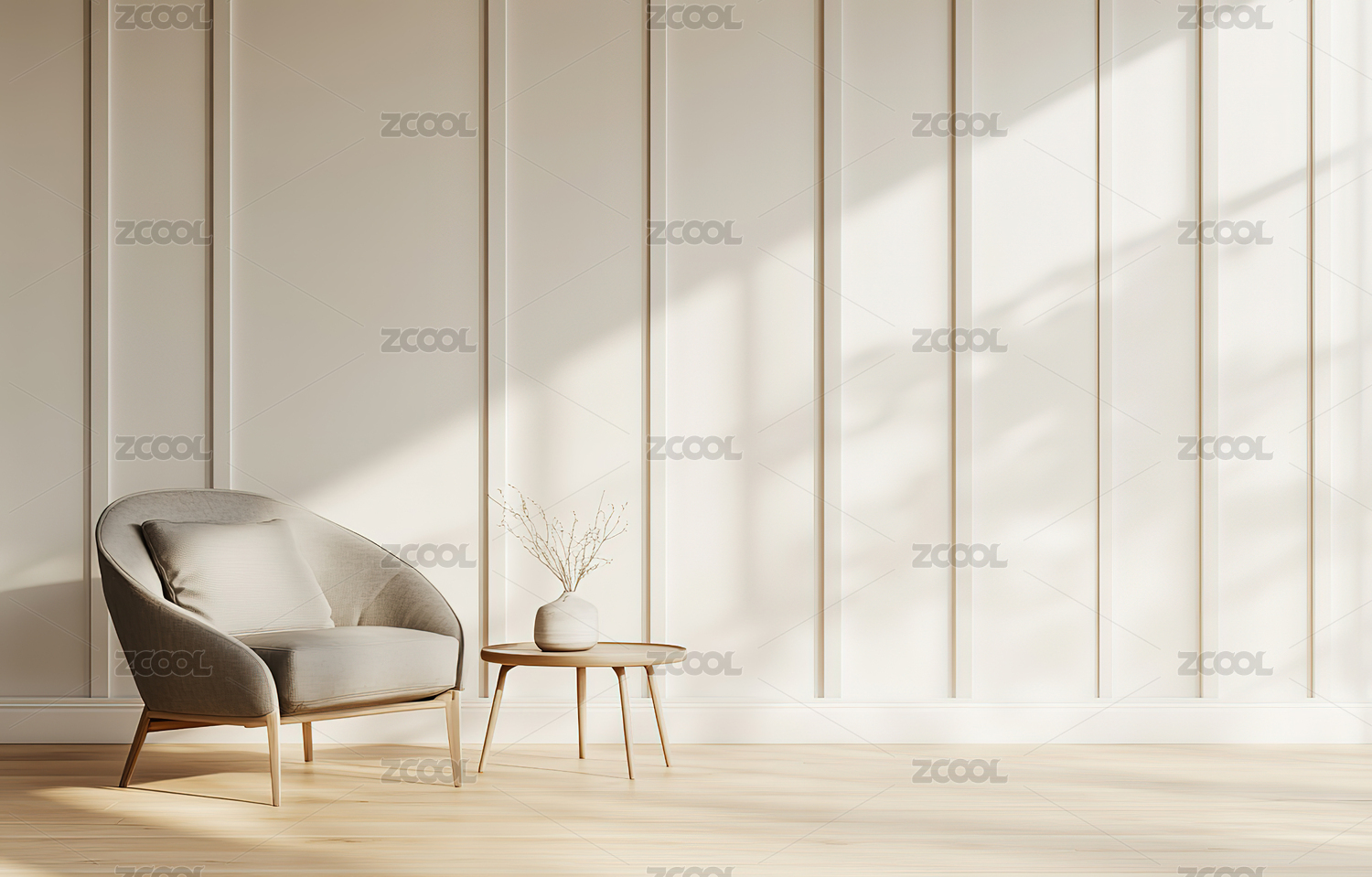 白色室内空墙面与混凝土地板有扶手椅与日光