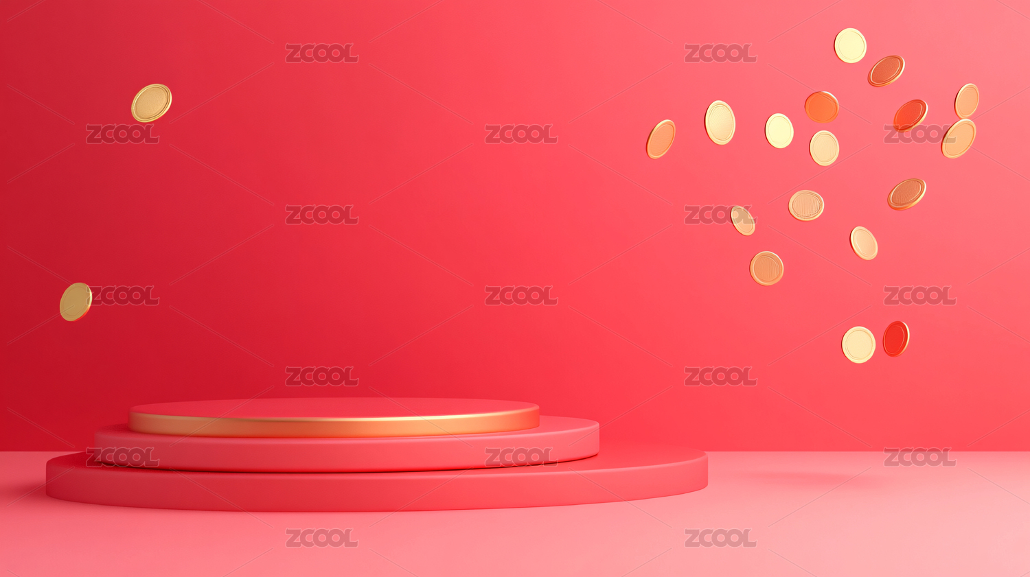 电商三维舞台场景金币喷出红色礼盒产品展台