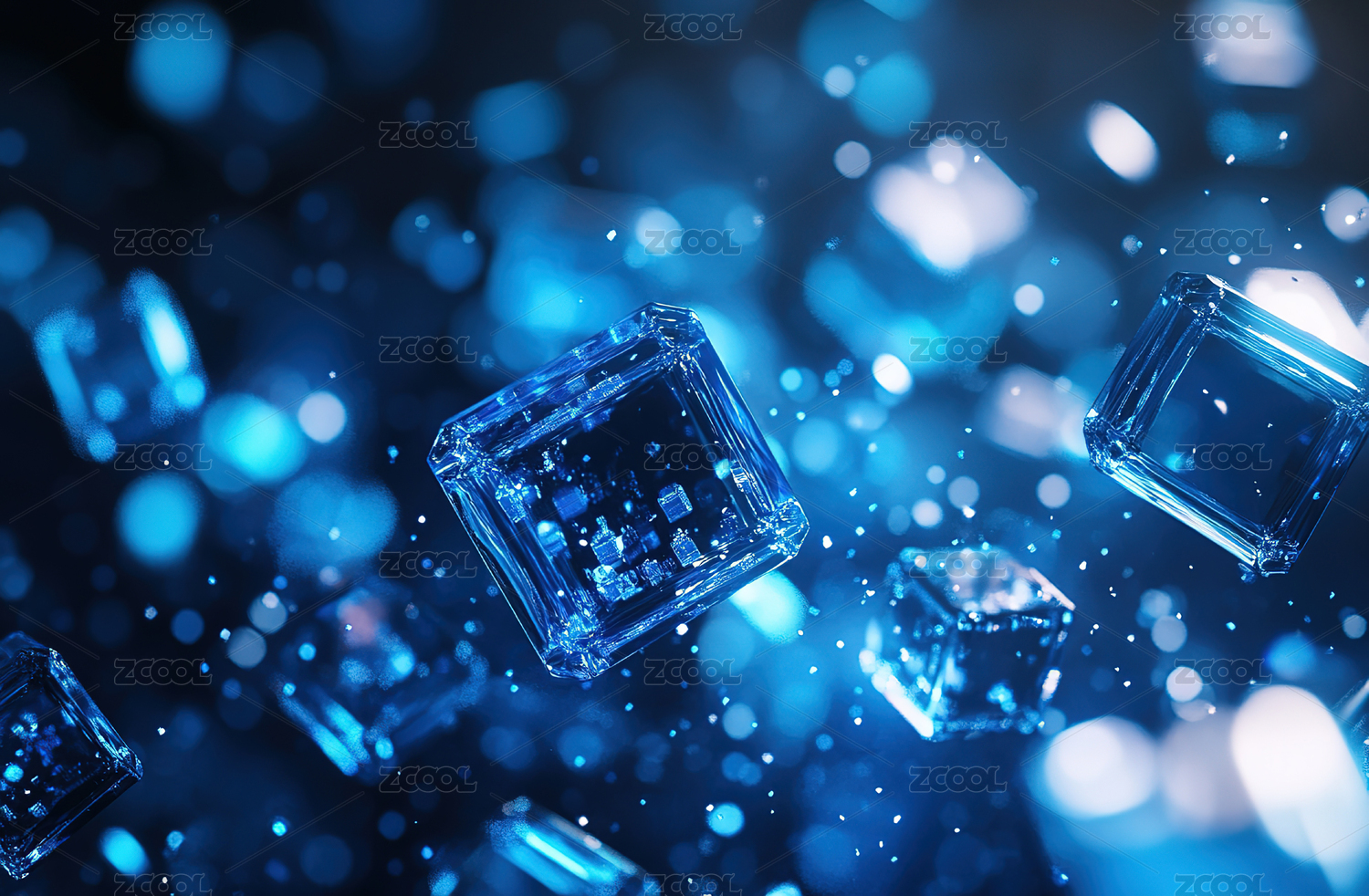 无人,AI数字艺术,冰块,透明,特写,蓝色,几何形状,背景,抽象,科学技术
