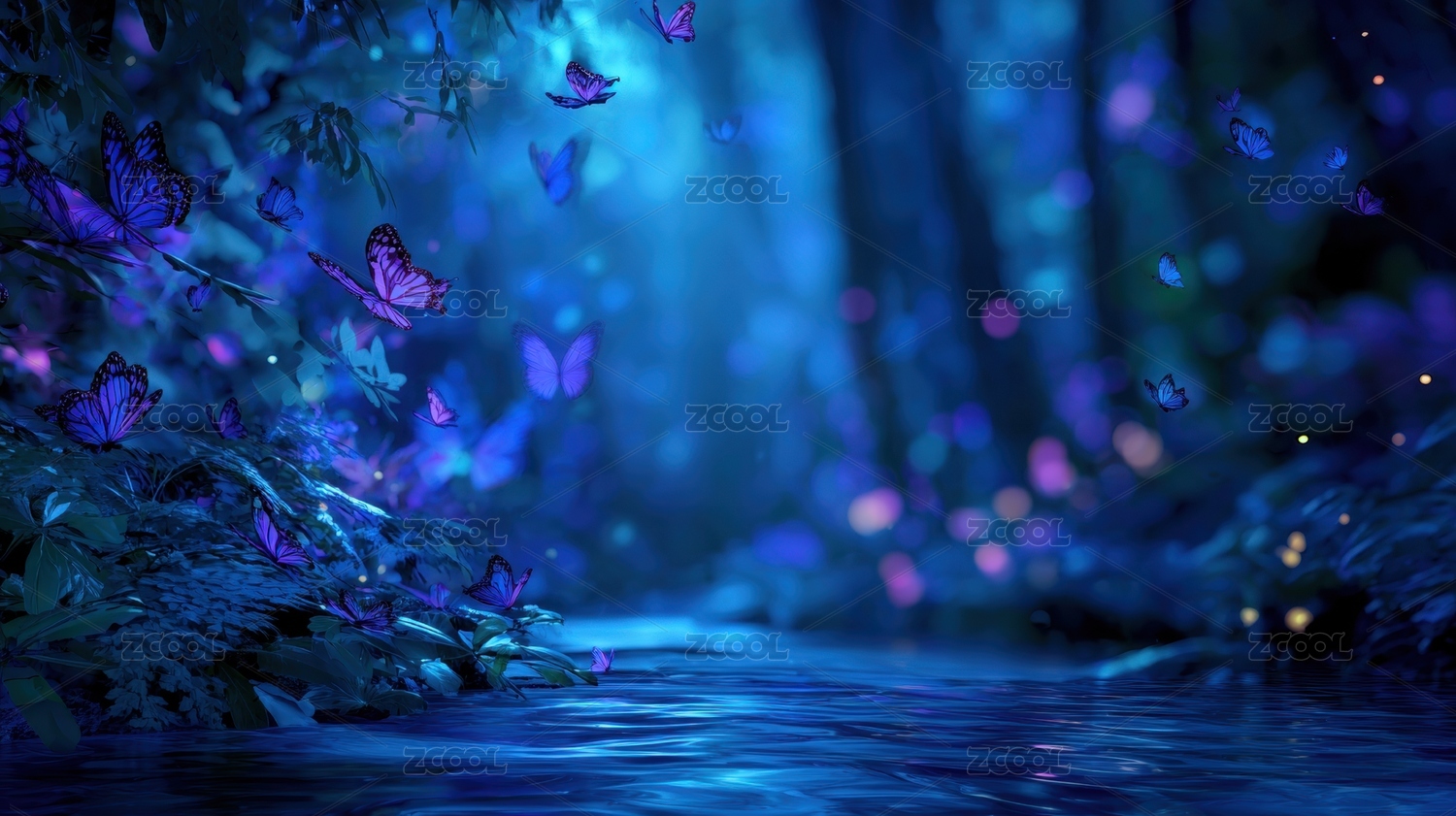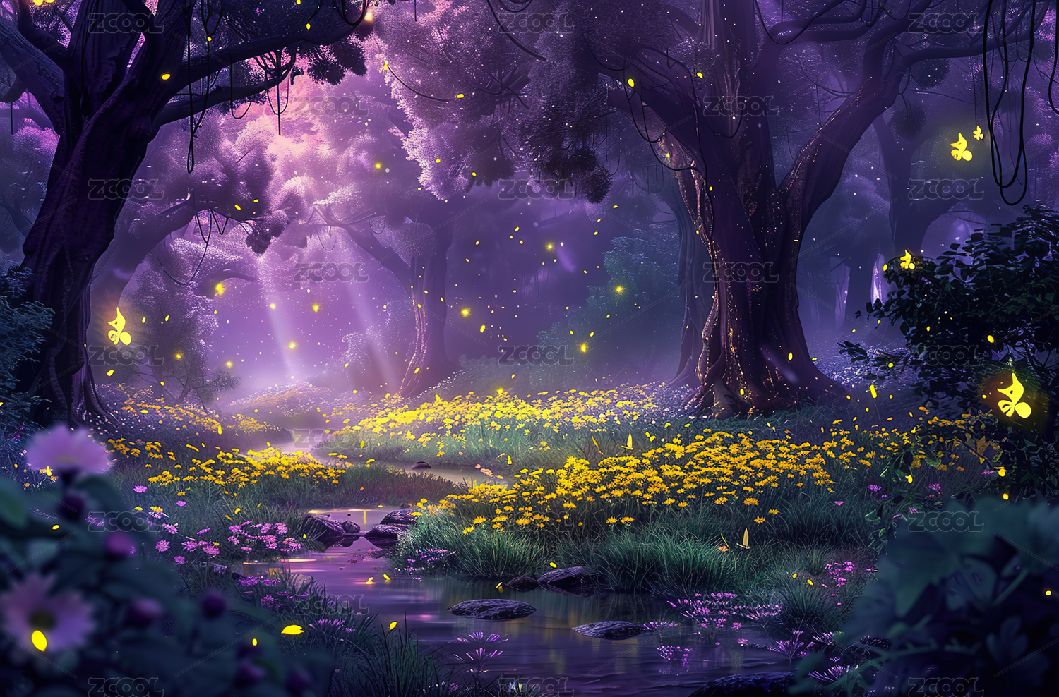 梦幻荧光色幽静有溪水的树林森林插画绘画