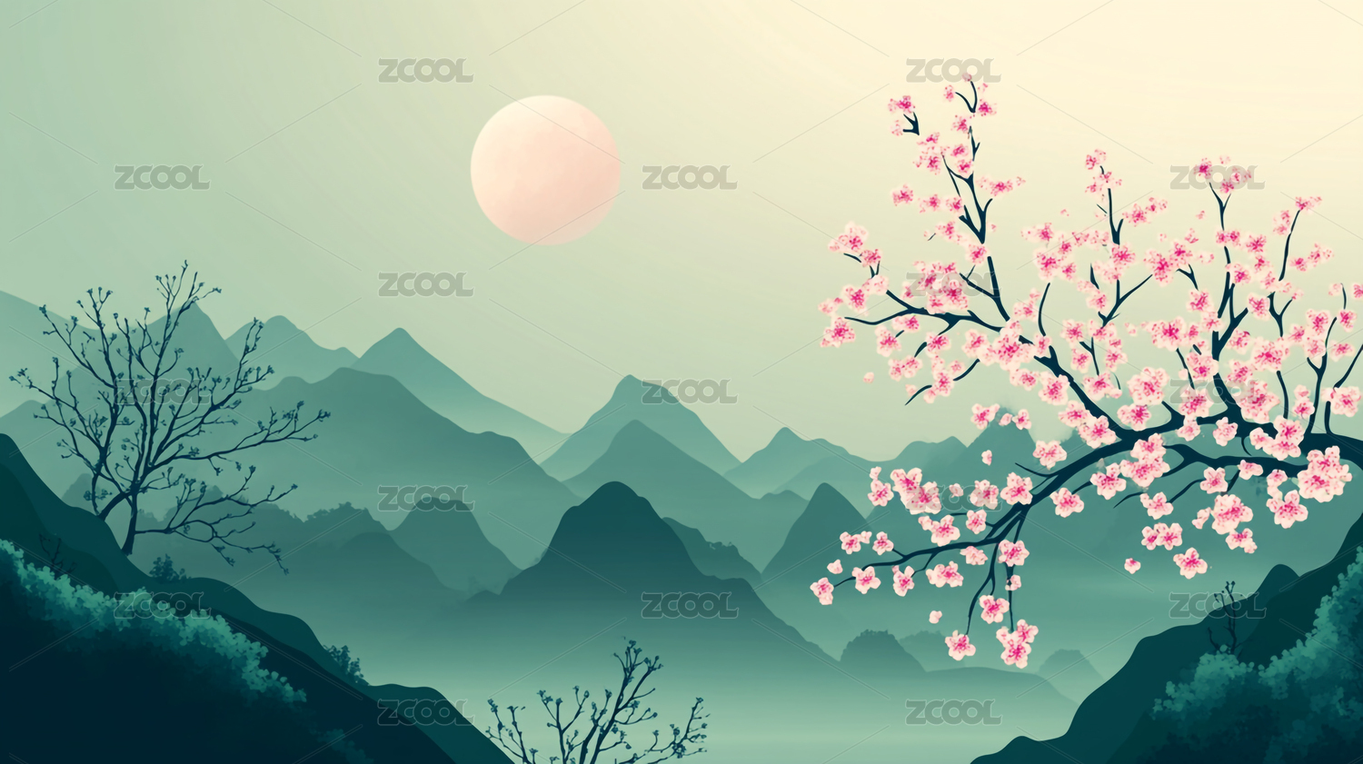 粉色梅花中国风插画太阳山峰