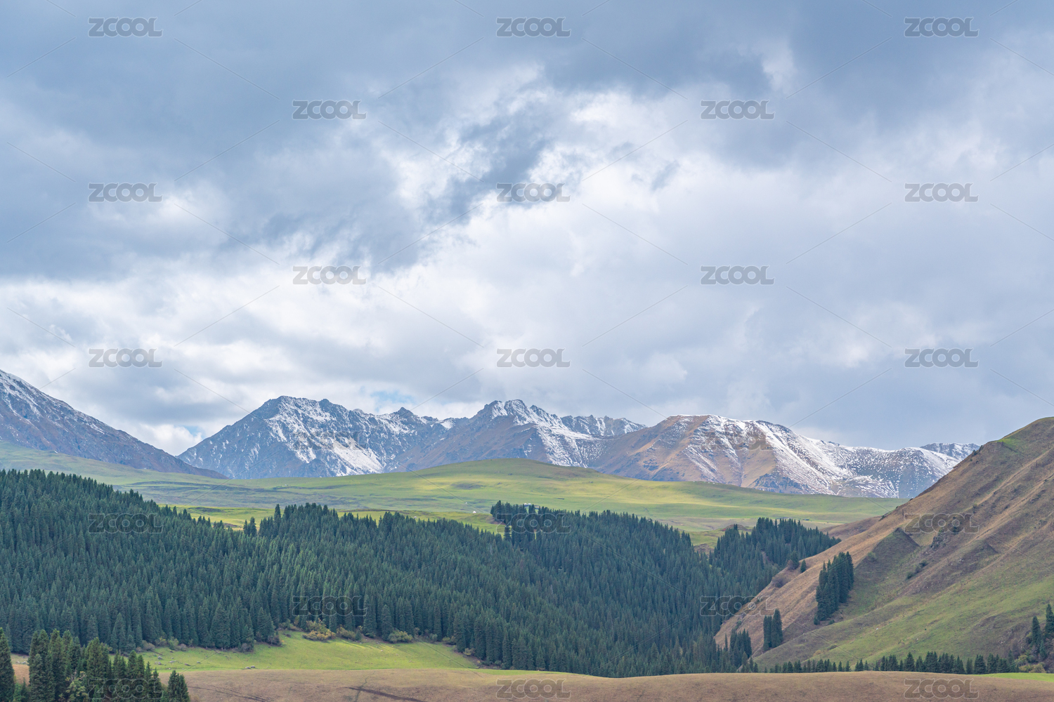 新疆,昭苏,夏塔,夏塔古道,古道,群山,雪山,绿地,针叶林,厚云