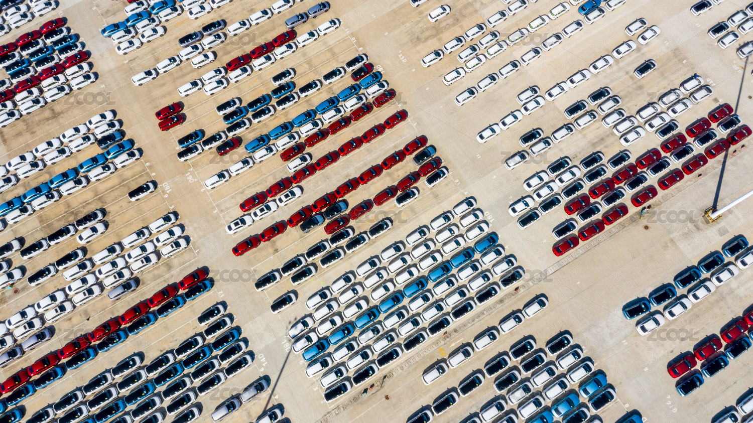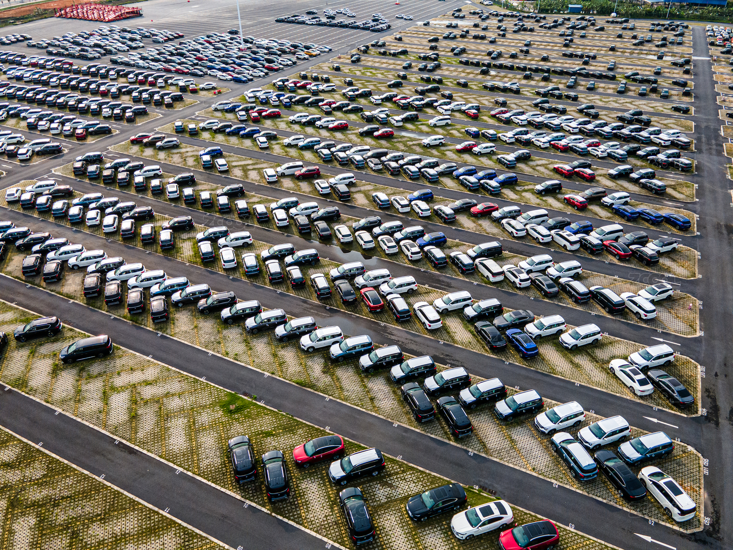 俯瞰四川成都汽车厂停车场里停放的密集汽车