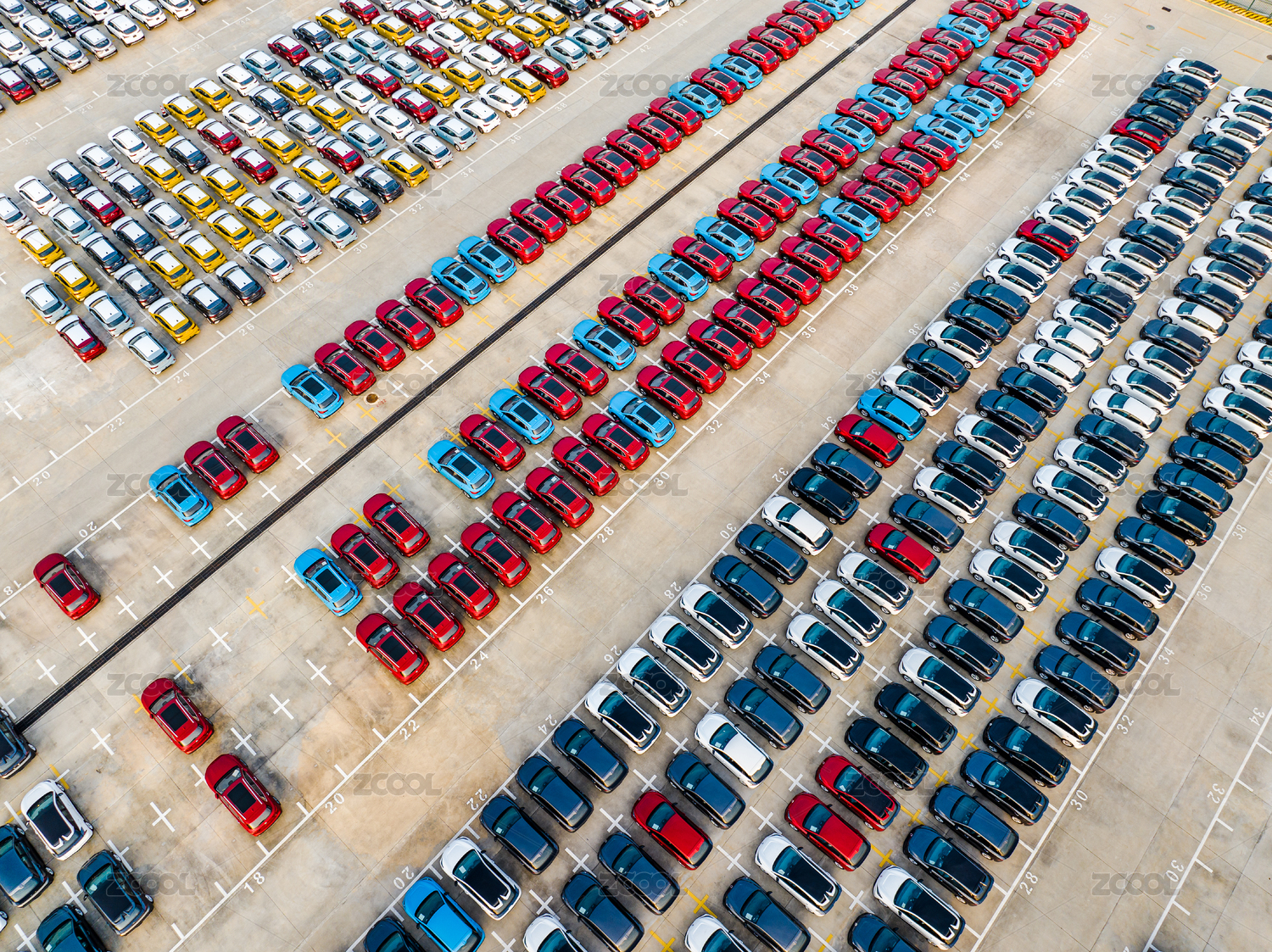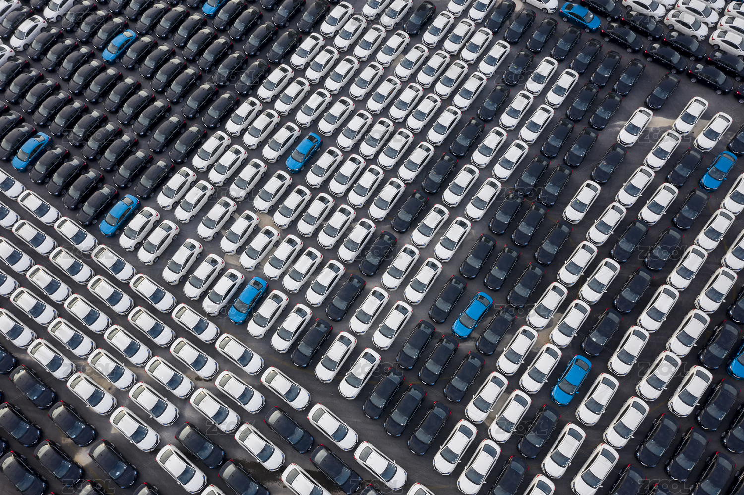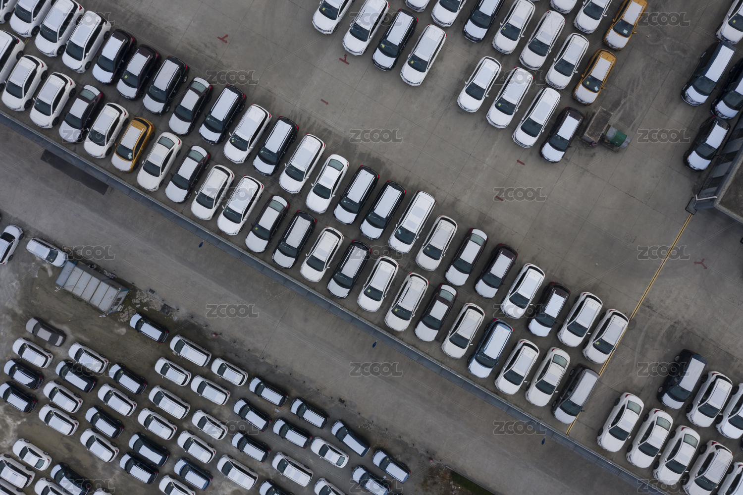航拍晴天里的汽车生产基地里整齐停放着的等待出厂的汽车