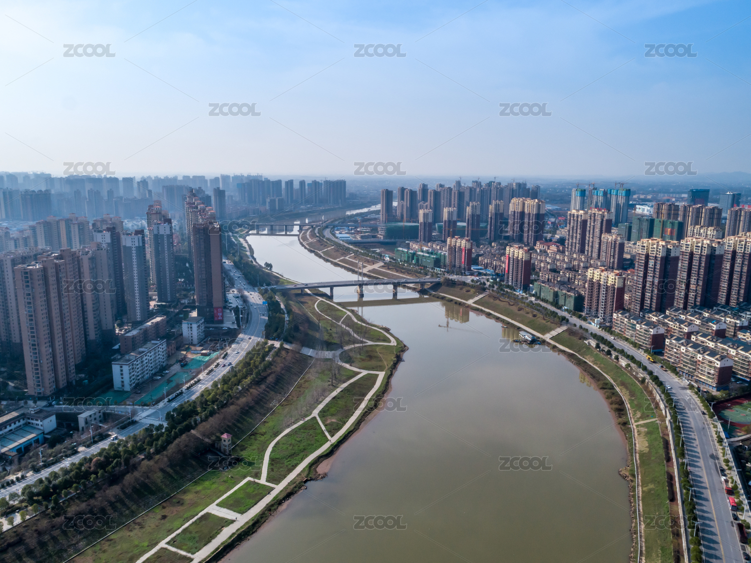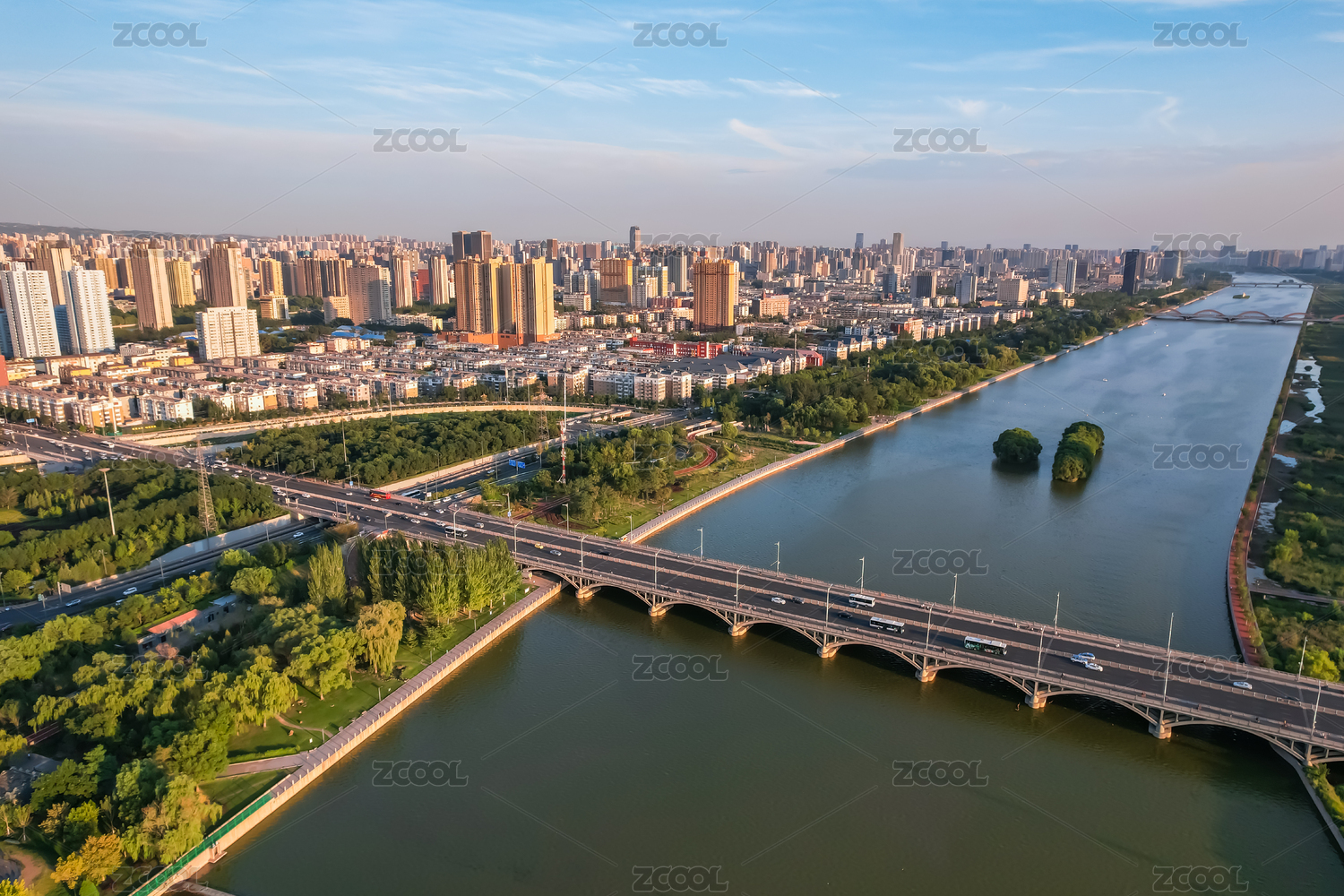 航拍中国河南禹州市颍河上的桥和两岸景观