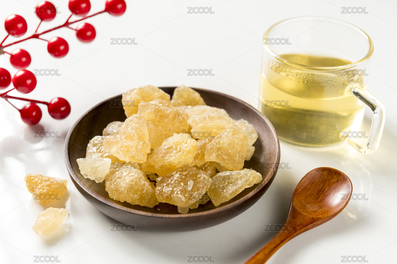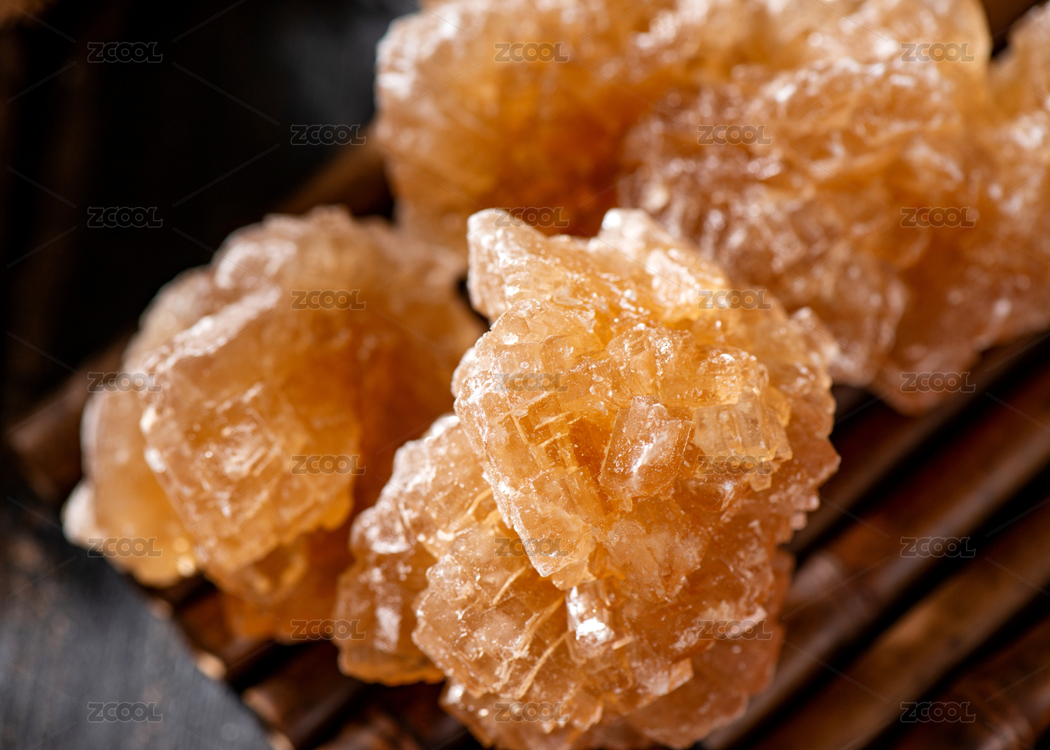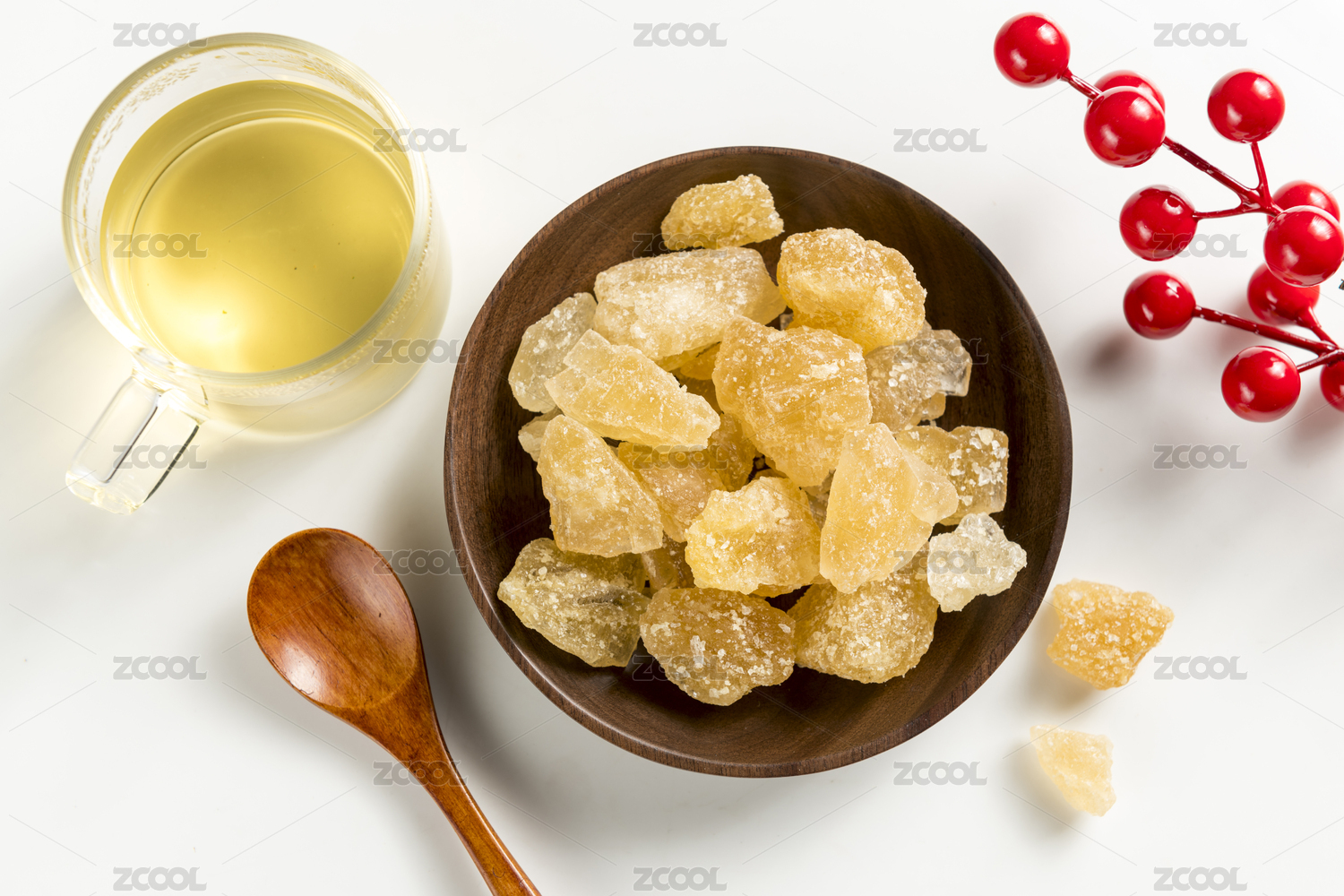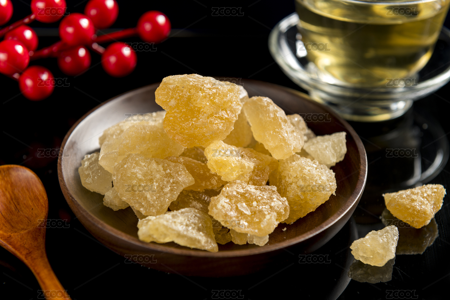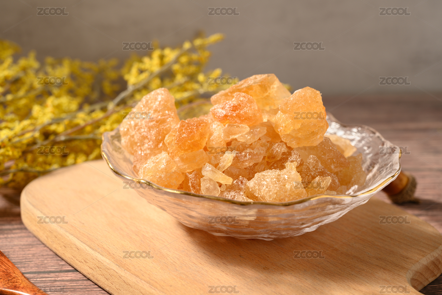 桌面上的玻璃碗里的美味可口的黄冰糖