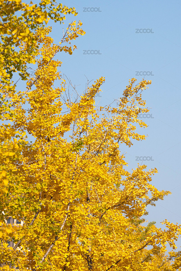 秋天的银杏林,仰视金色的银杏叶及湛蓝的天空