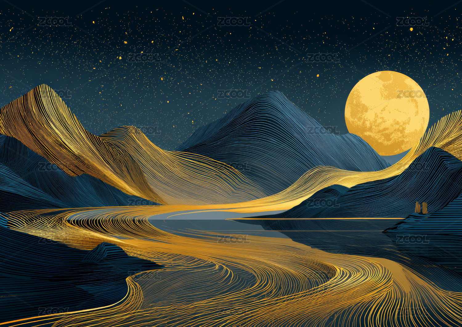 蓝金色山水山脉插画