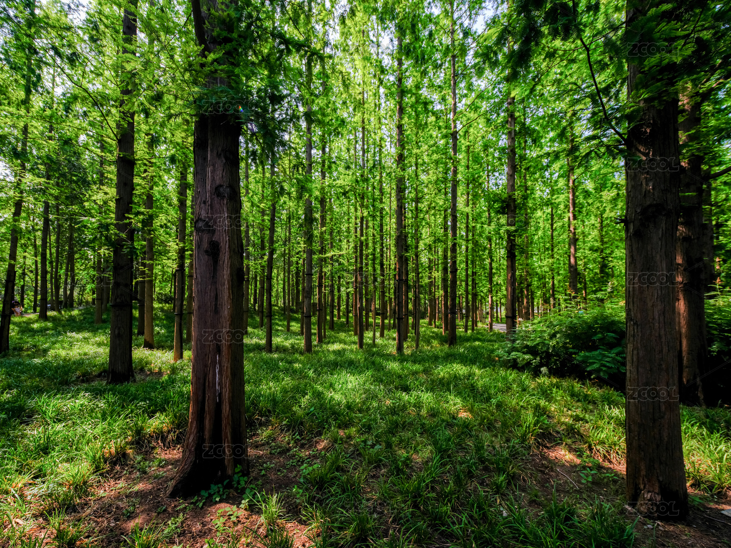 中国浙江杭州西湖景区,曲院风荷景点的阳光杉树林与草地
