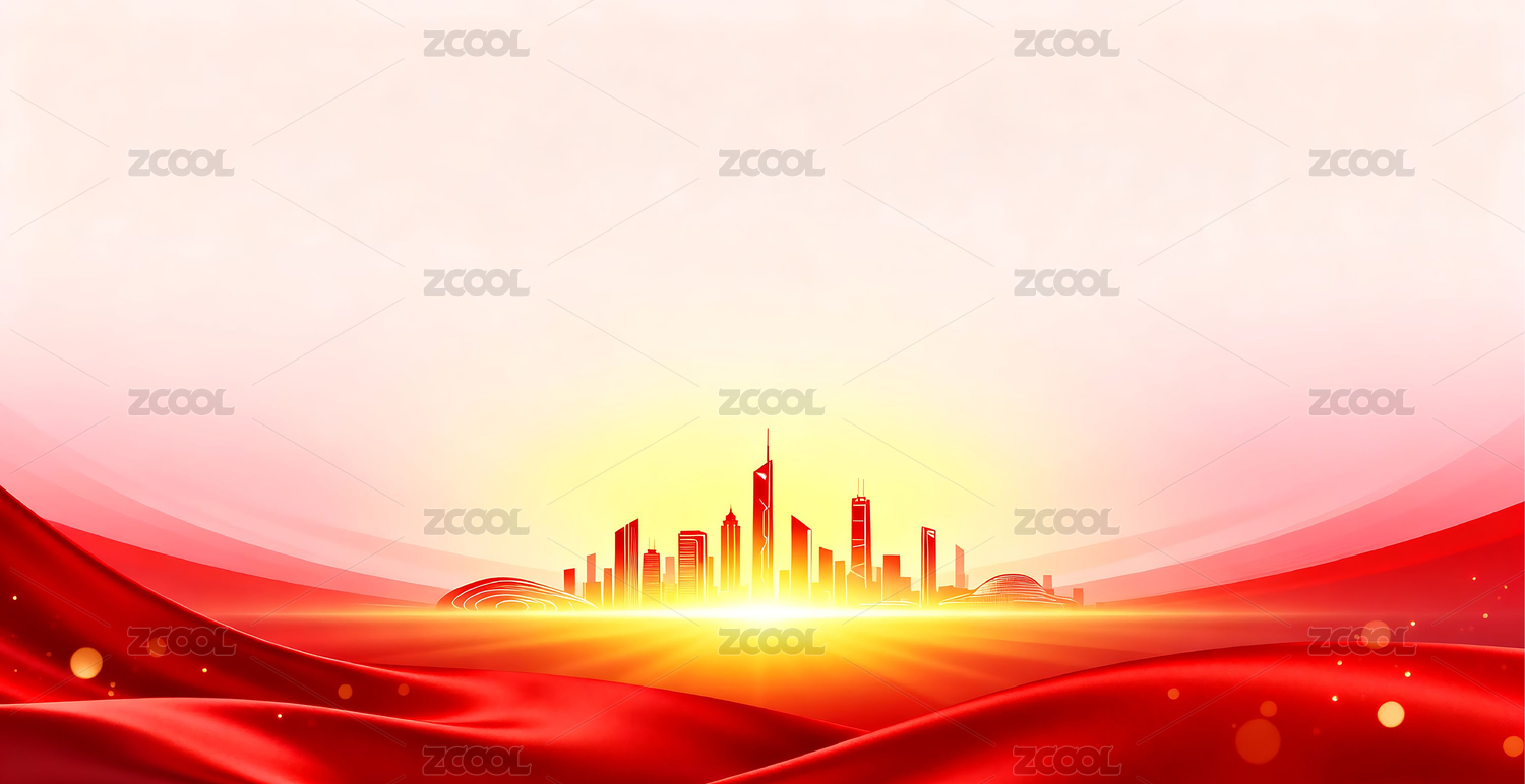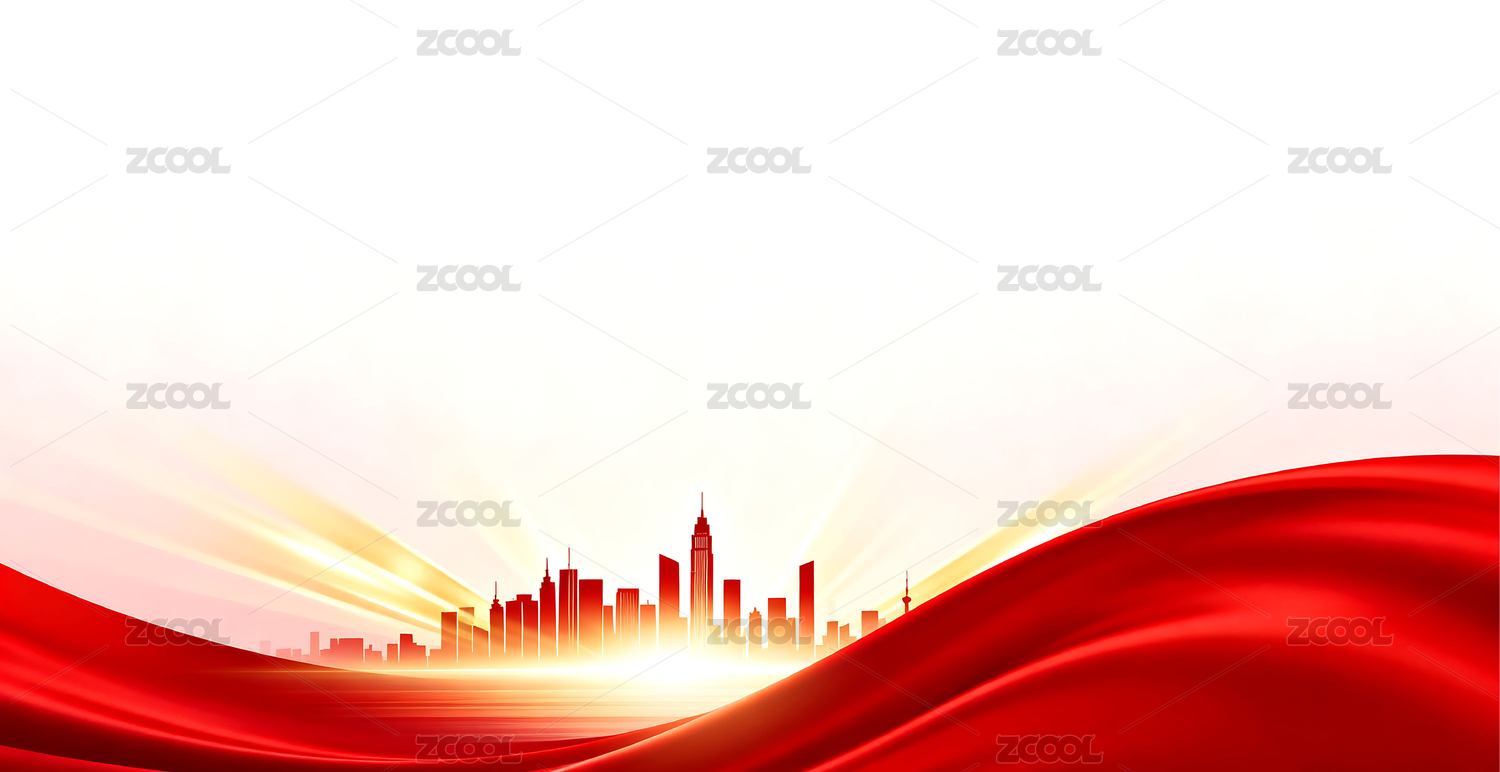 城市蓝天背景丝绸渐变红旗飘扬素材矢量图