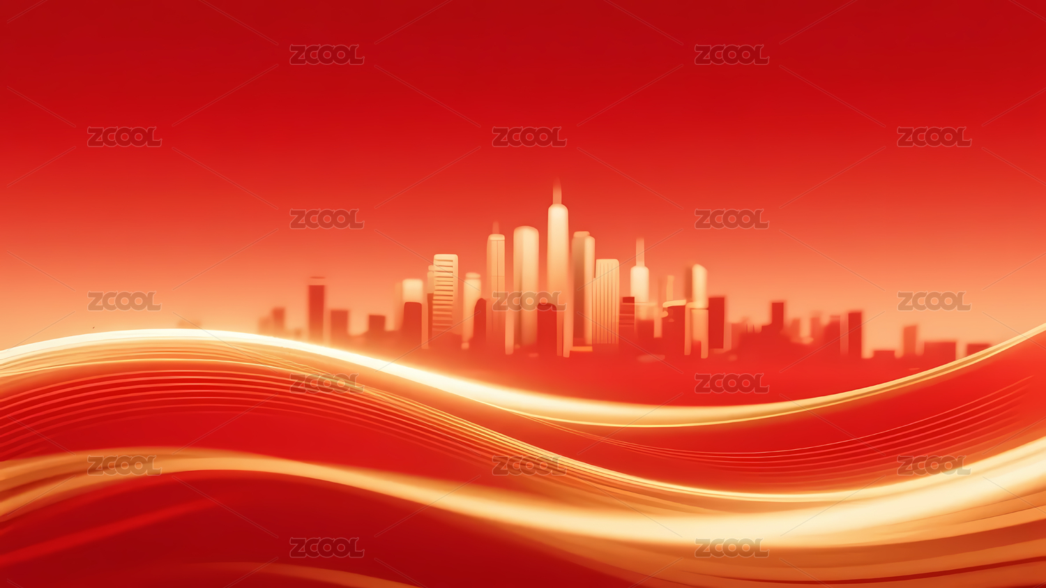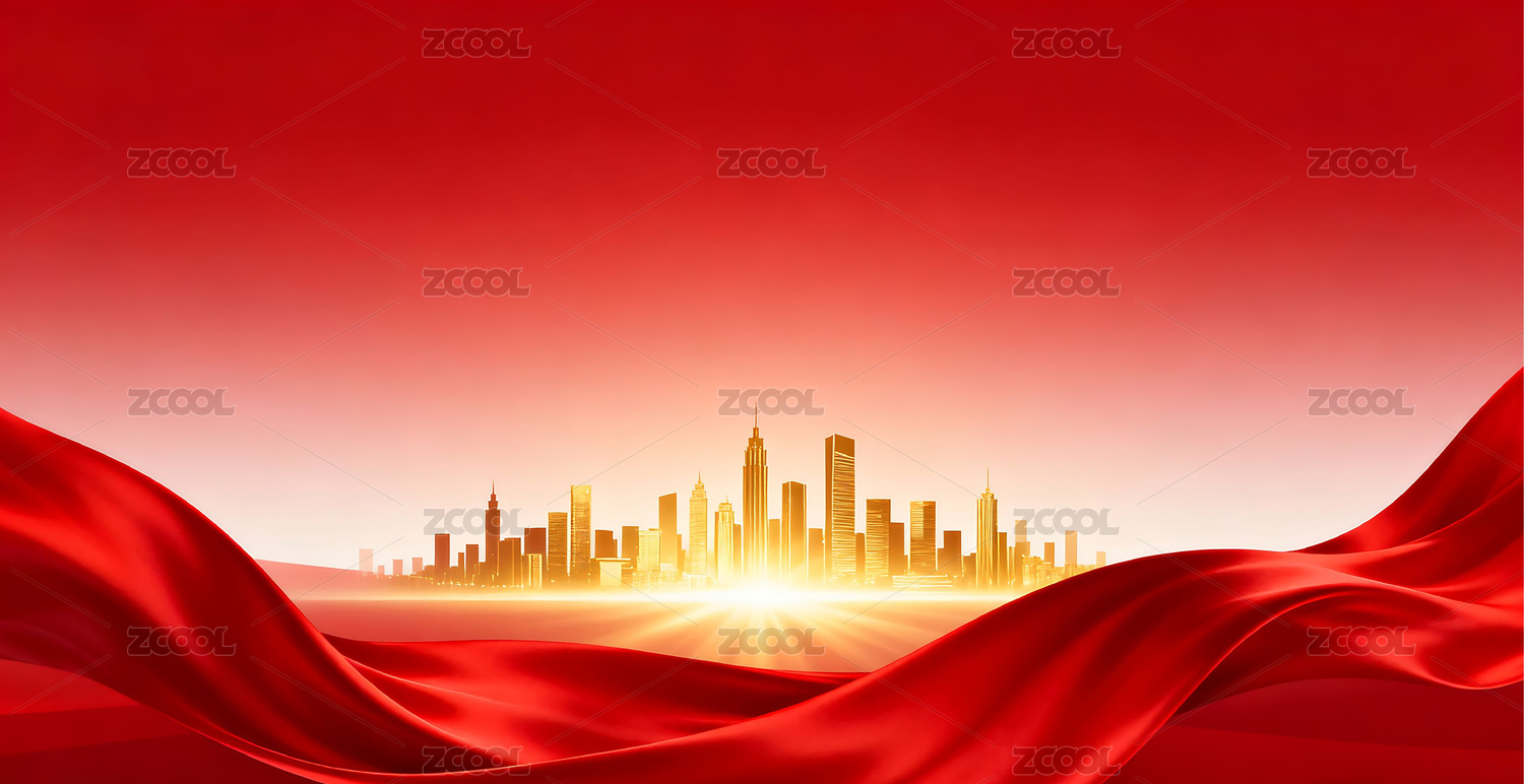 红金色绸缎布料城市建筑天际线商务庆典背景