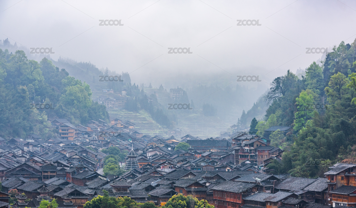 清晨雾中的贵州西江千户苗寨全景