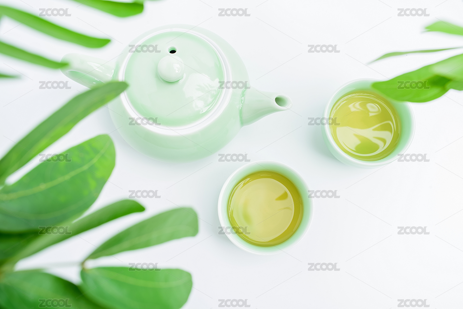 汝瓷茶壶汝瓷茶杯摆放在木制茶盘中