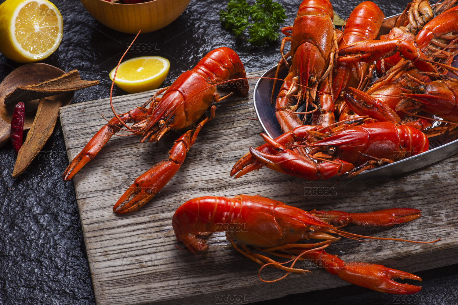 木板背景上满满一盘麻辣小龙虾