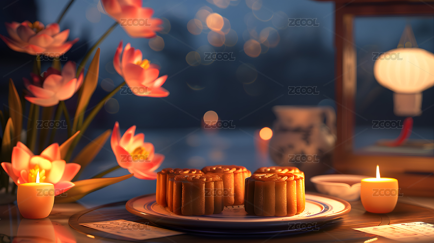 中秋月夜与传统月饼摆放场景