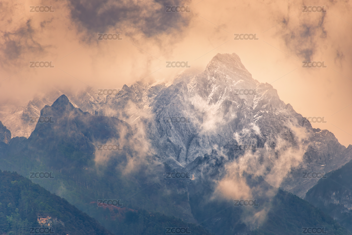 中国云南玉龙雪山在烟云缭绕中若隐若现