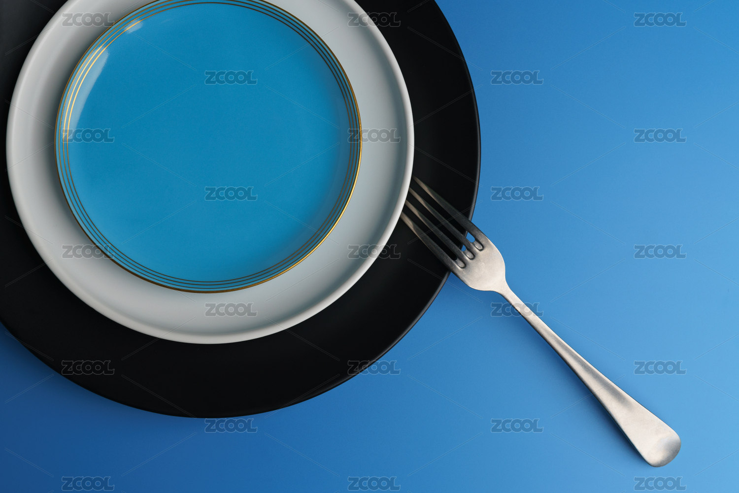 蓝色背景下的盘子和叉子餐具特写镜头