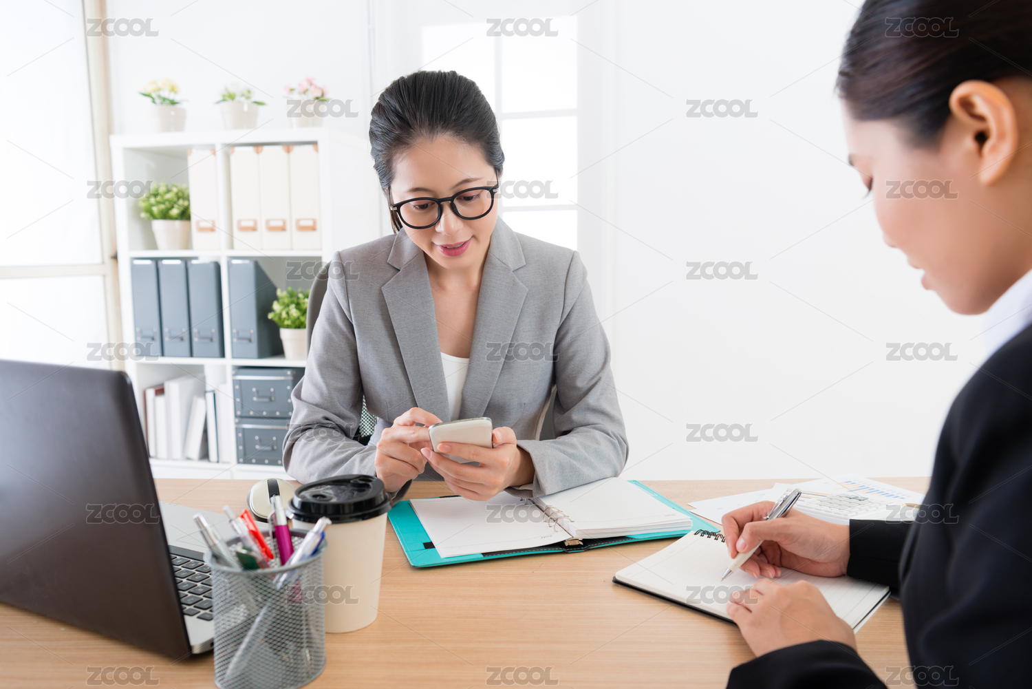 亚洲女助理写下的亮点和老板在手机上处理会议与商务人士的采访谈话。