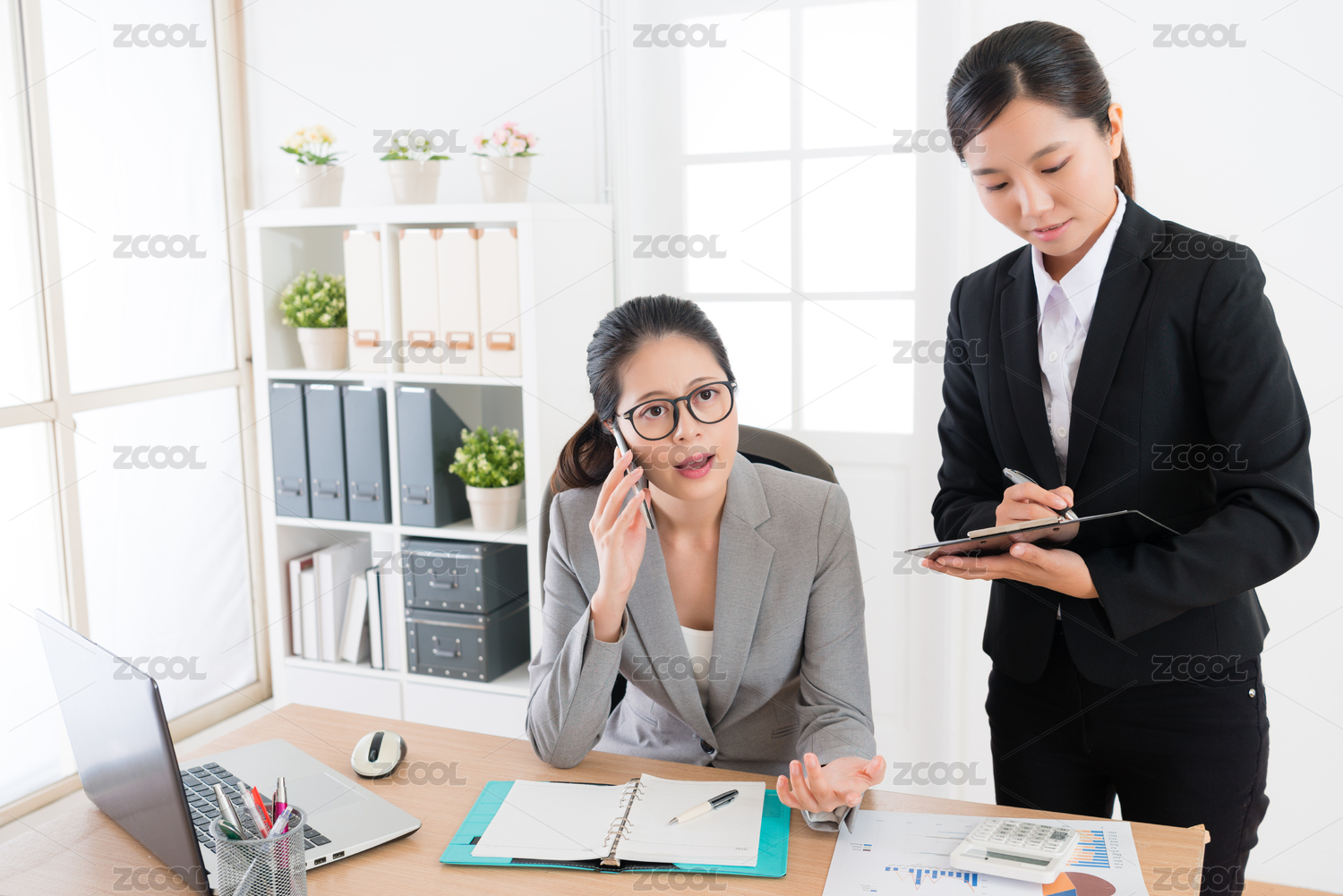 亚洲女老板说话的办公室小姐的助手。主管使用智能手机设备仪器辅助说写下来,使用笔记本电脑和泛在公司办公室。