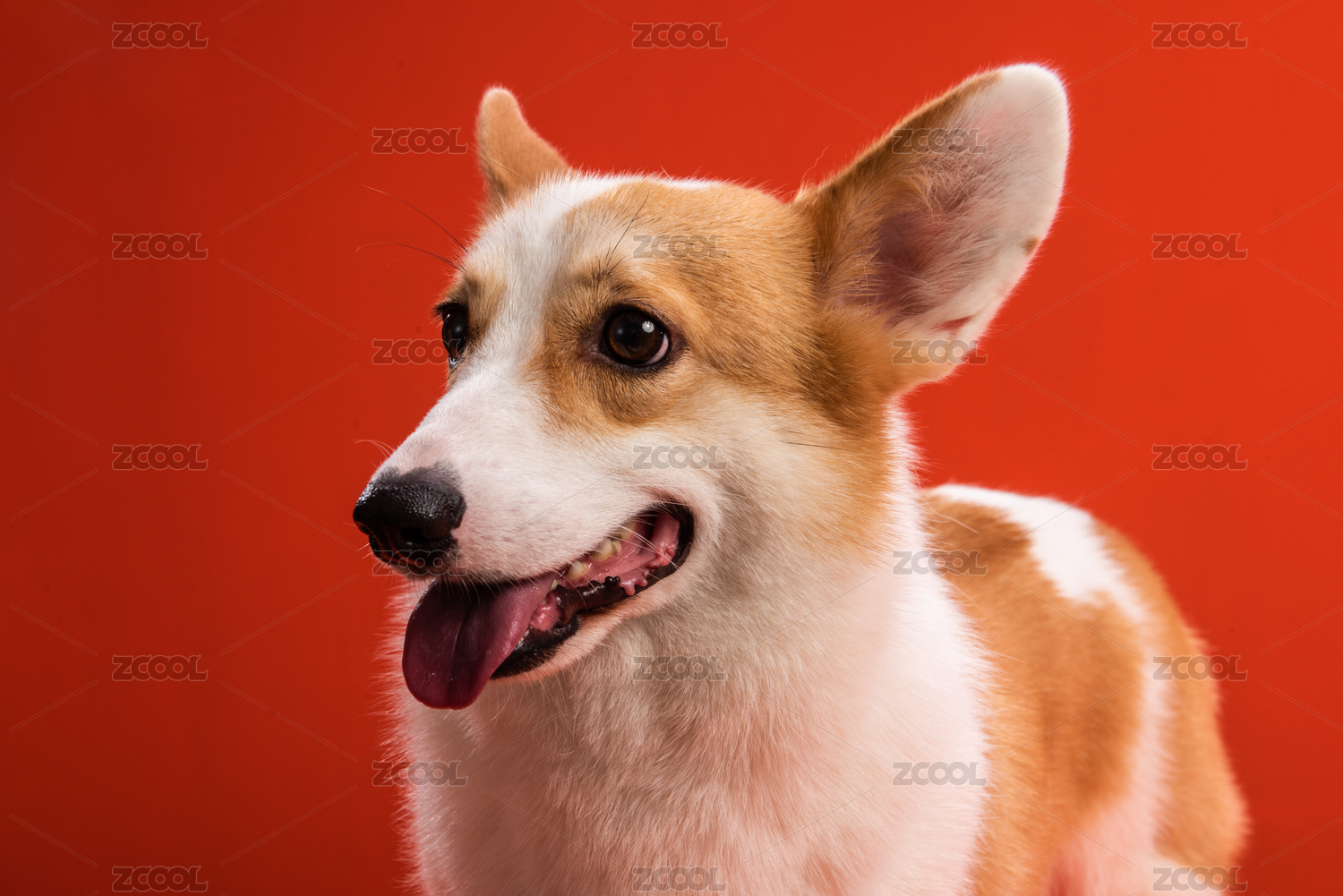 在红色背景下柯基狗