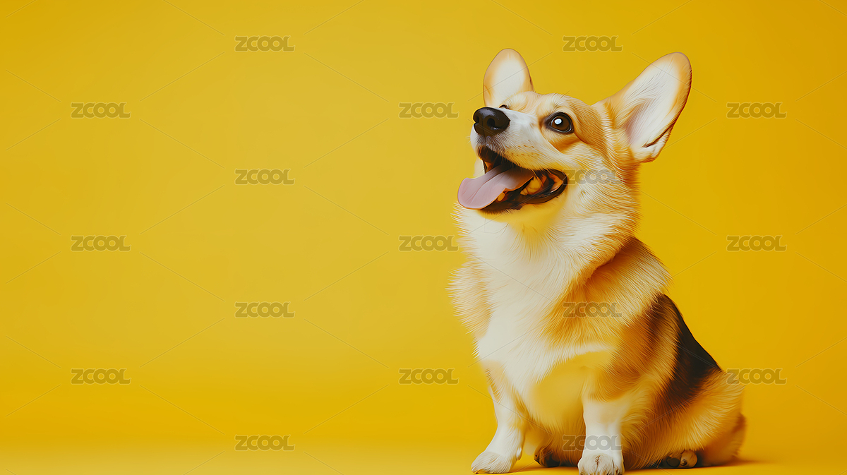 开心的柯基在黄色背景下微笑