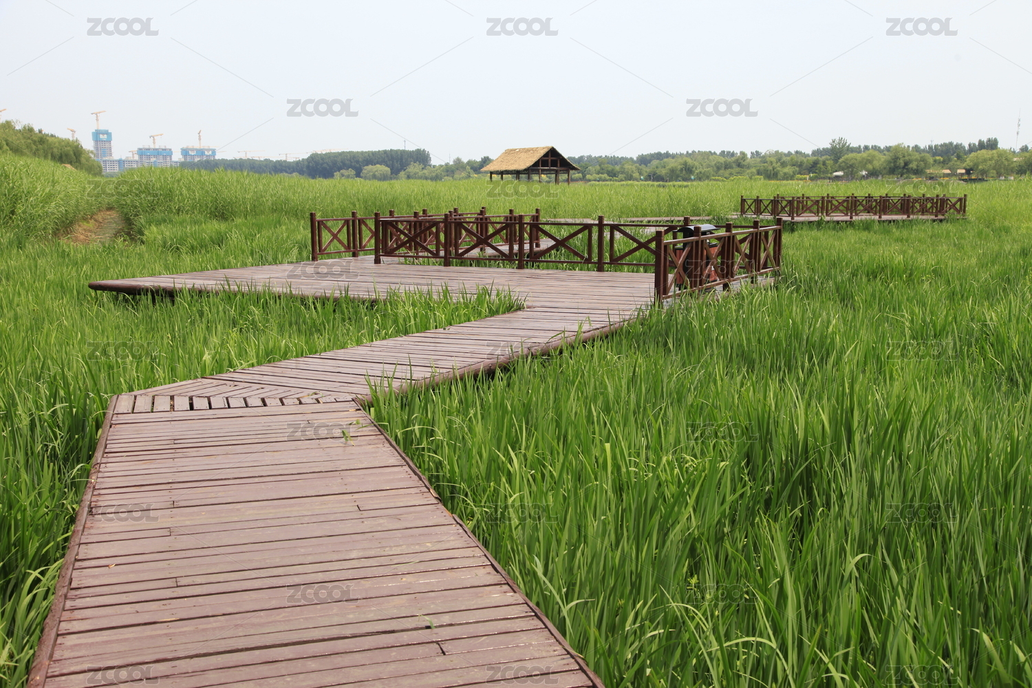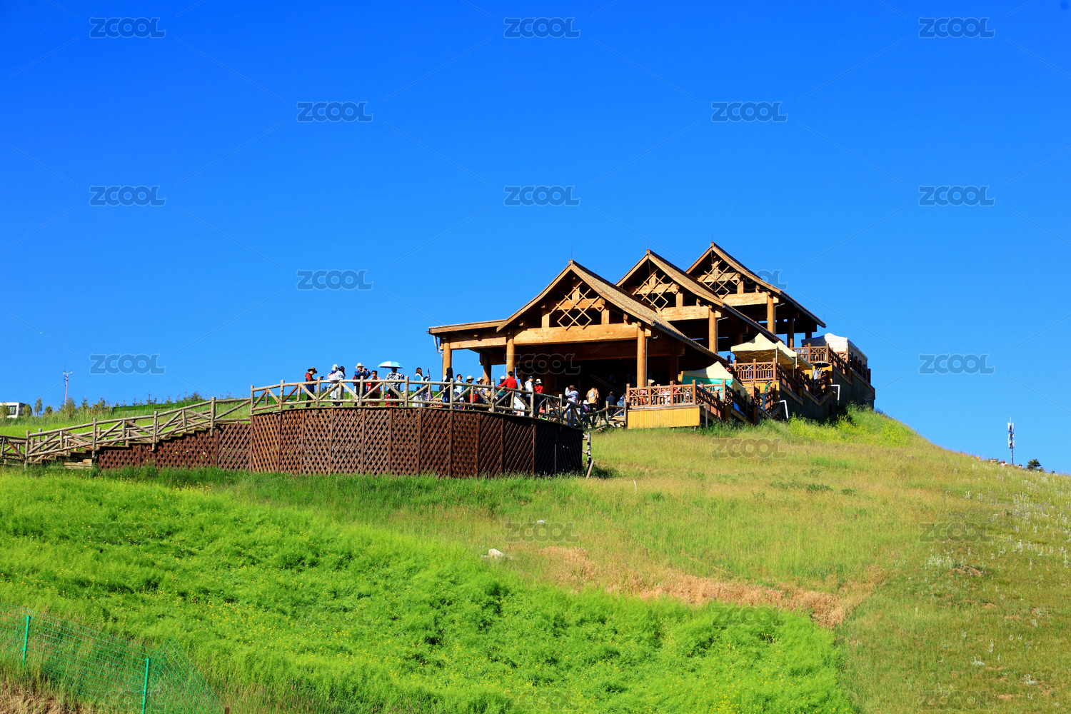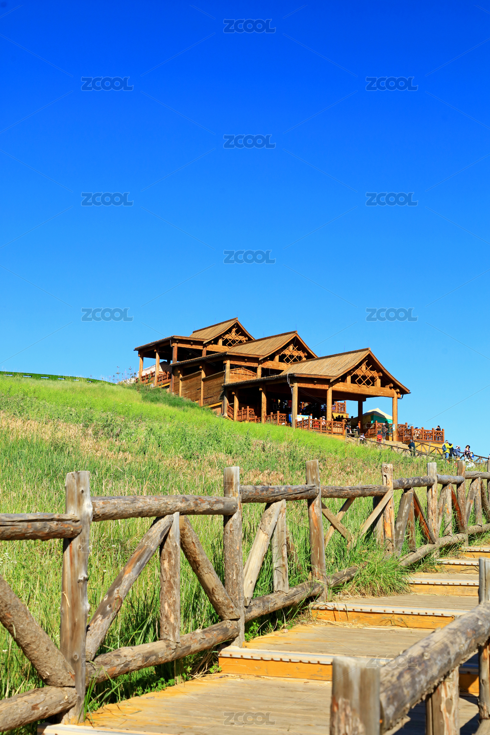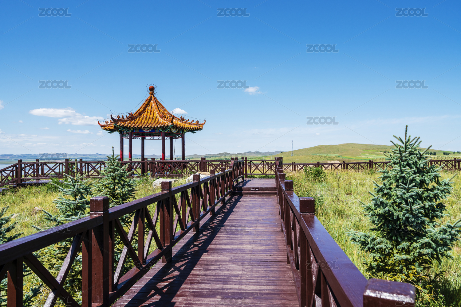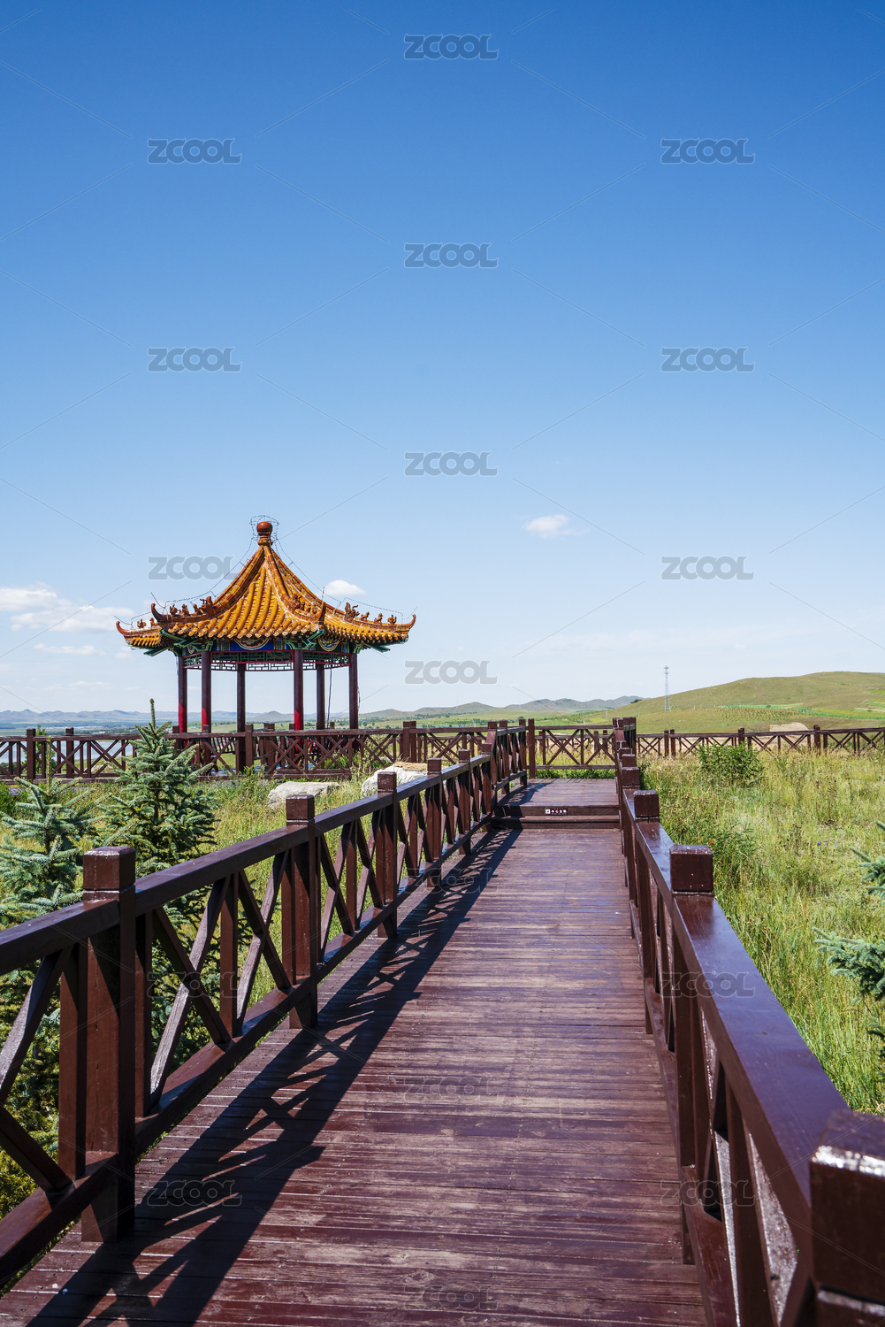 站在内蒙古乌兰布统草原景区木栈道上欣赏美景的美女