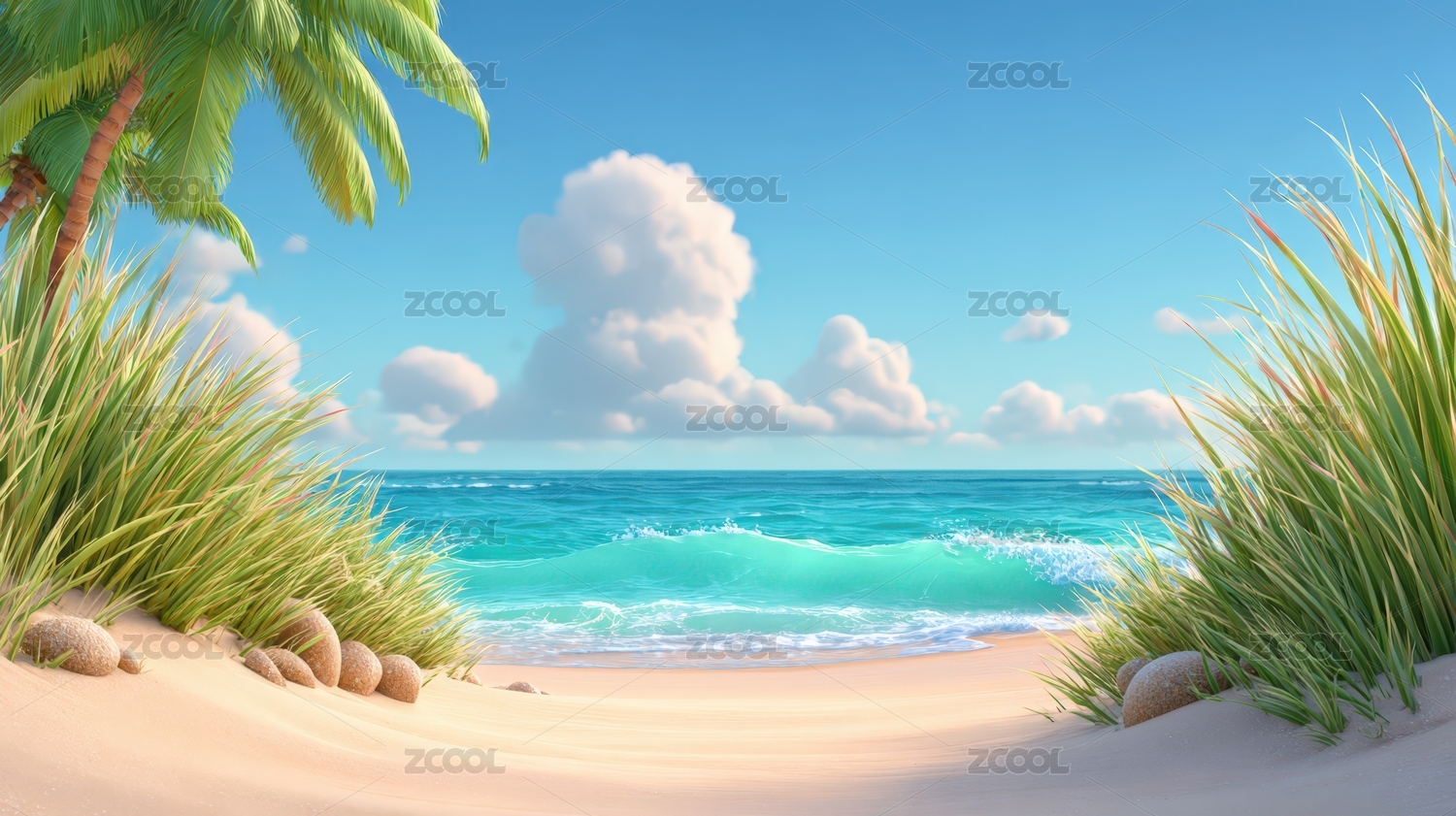 三维卡通风格的热带海滩景观
