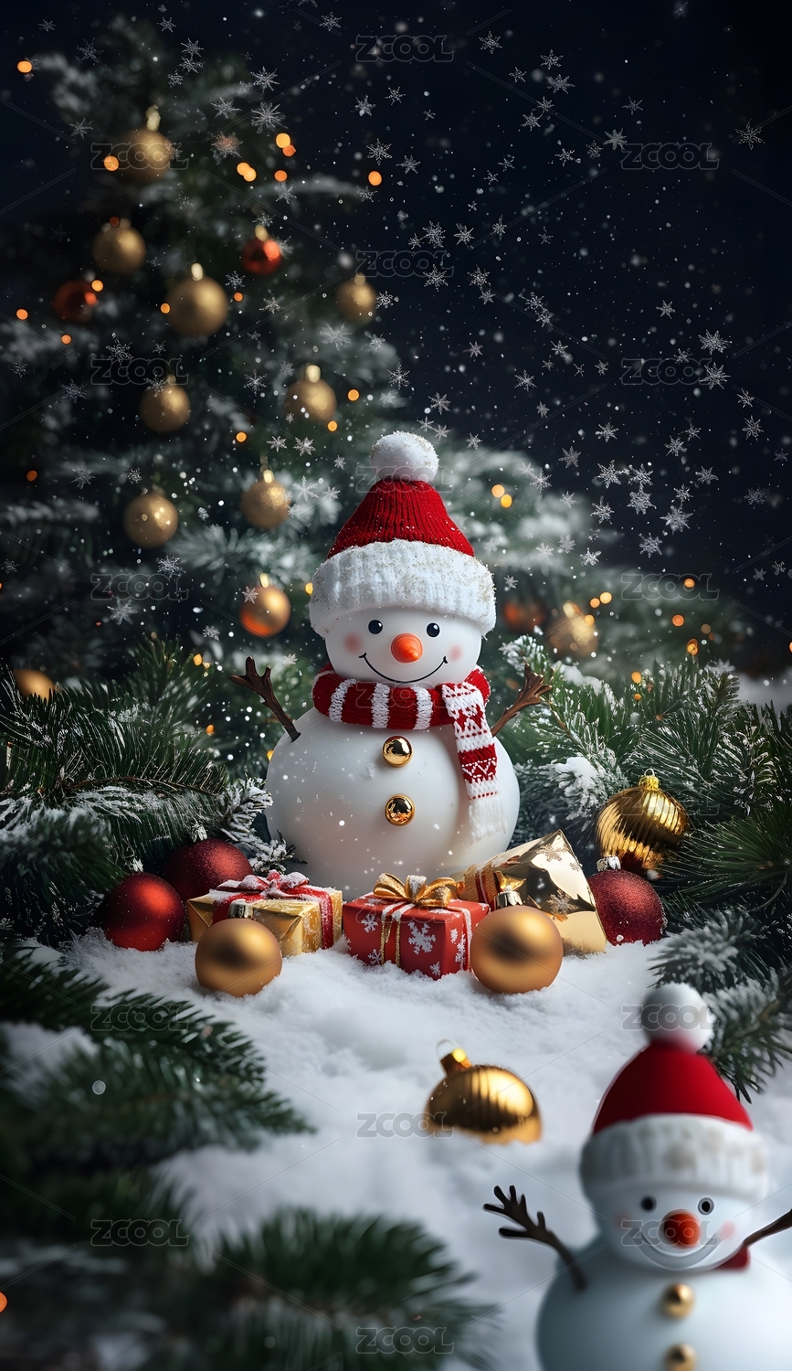 冬天的温暖圣诞节仔雪地里有圣诞树和小雪人