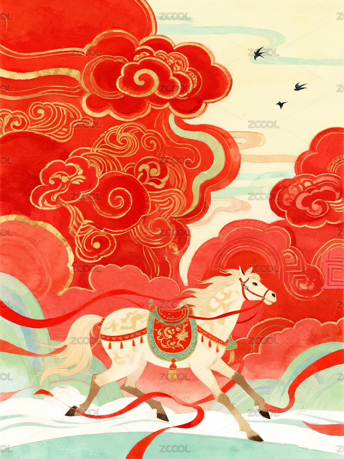 2026马年飞翔的白马青山祥云白鹤国潮国