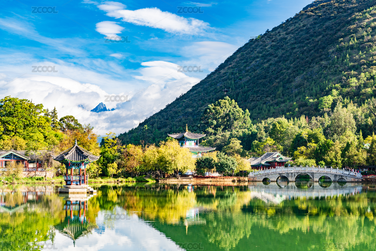中国云南省丽江黑龙潭公园,背景是玉龙雪山