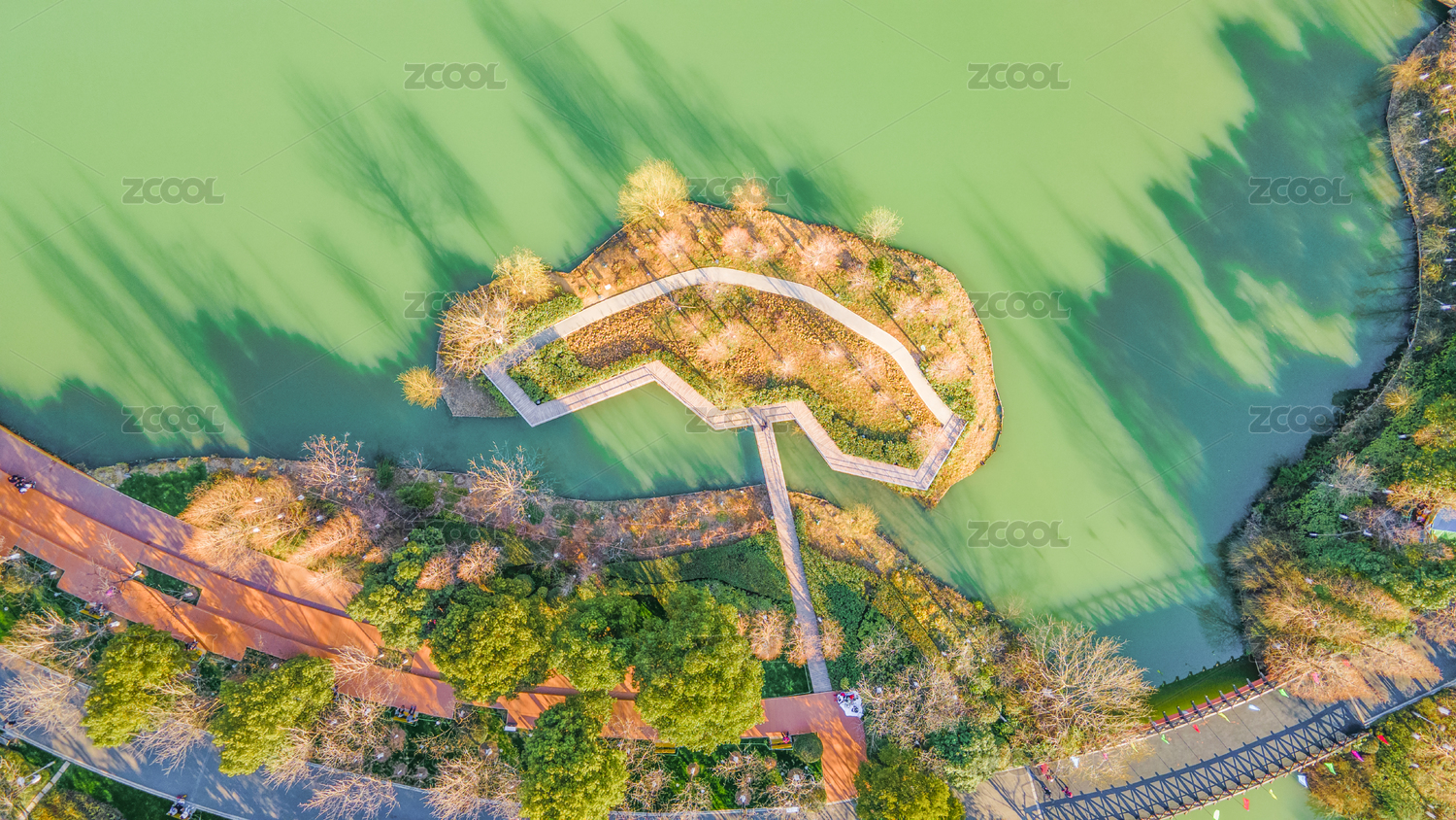 航拍郑州高新区双湖科技城湖心岛人工岛荒岛