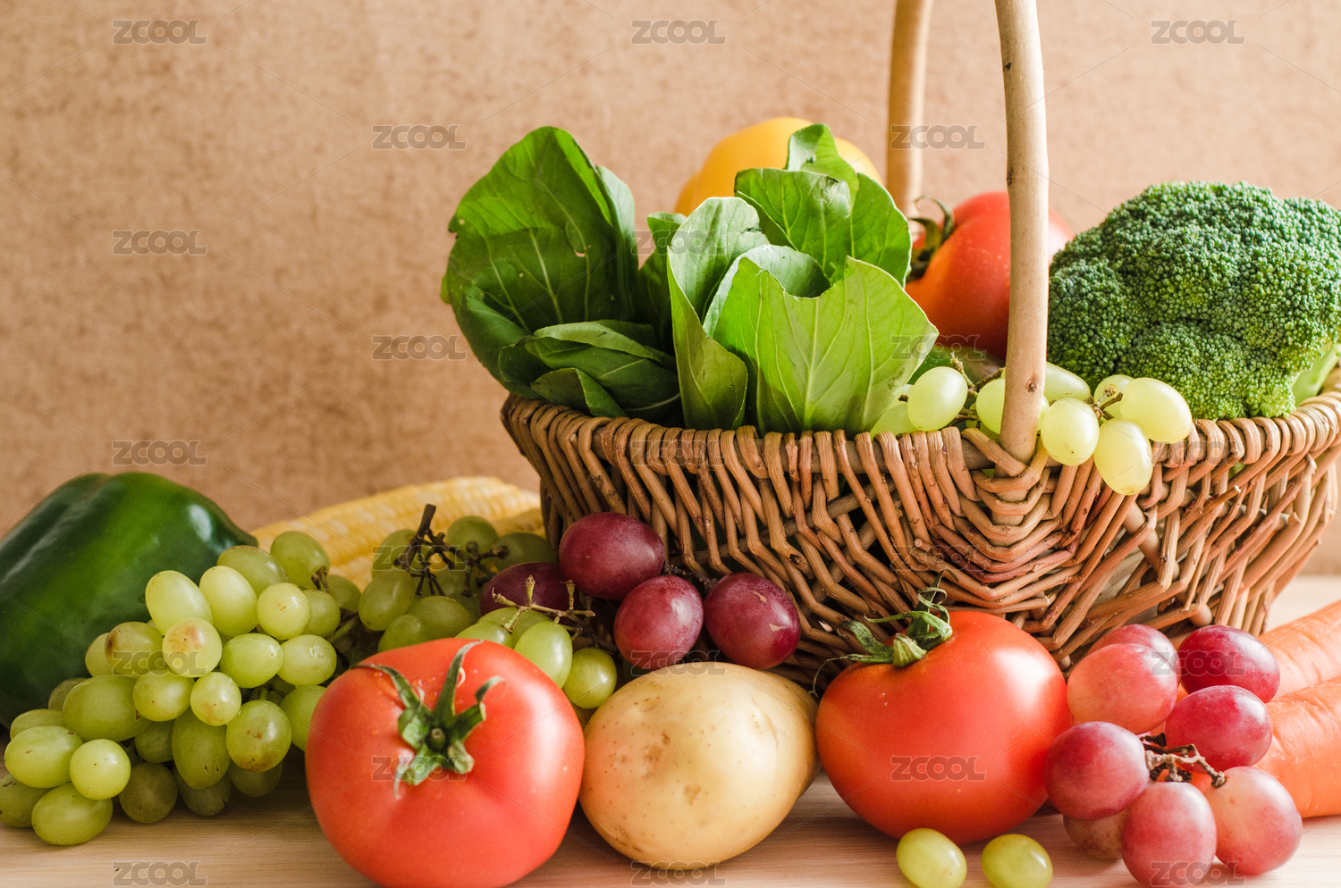 木桌子上菜篮子里的新鲜的水果蔬菜