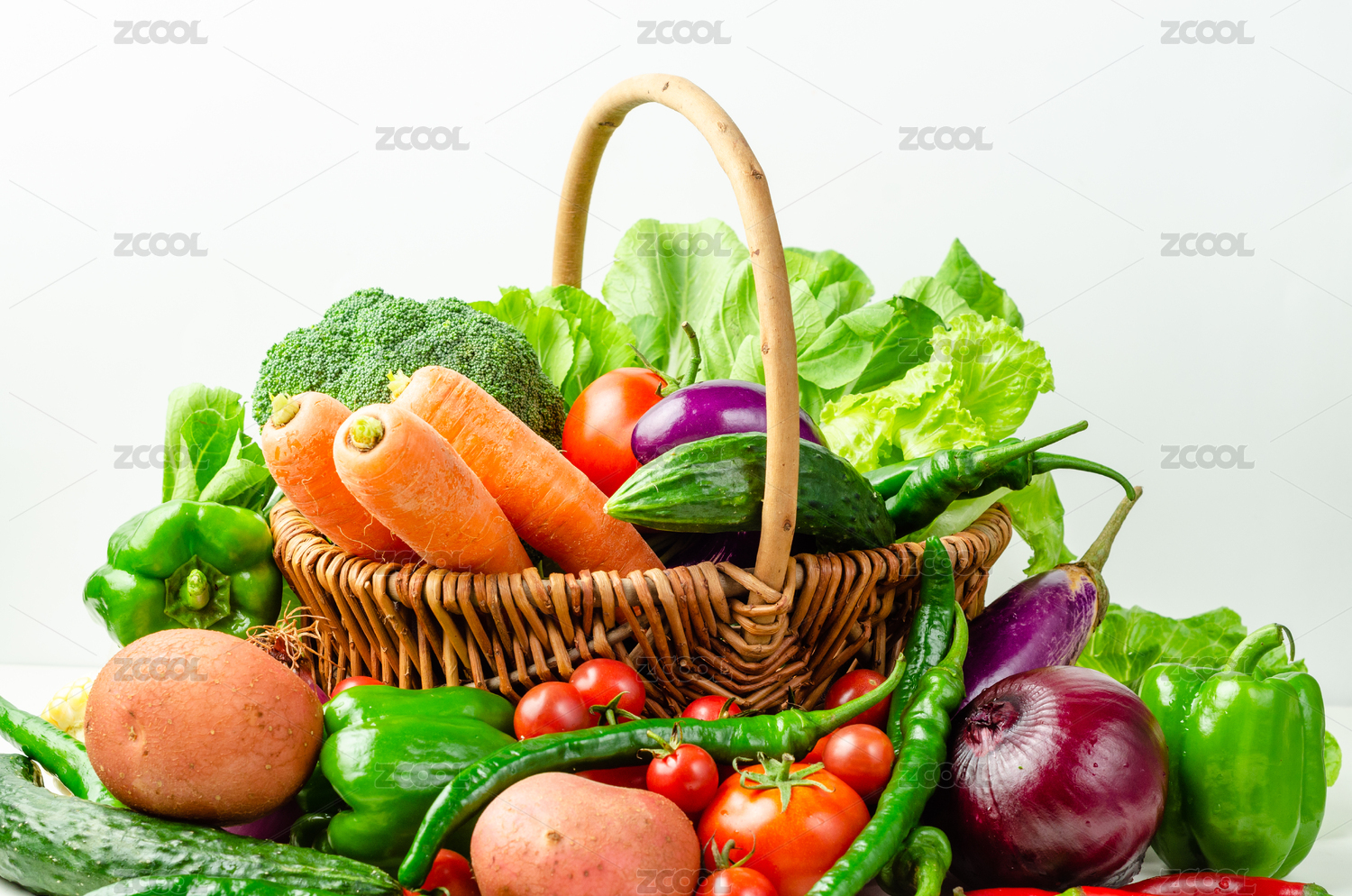 装着新鲜水果蔬菜的菜篮子放在白色背景里