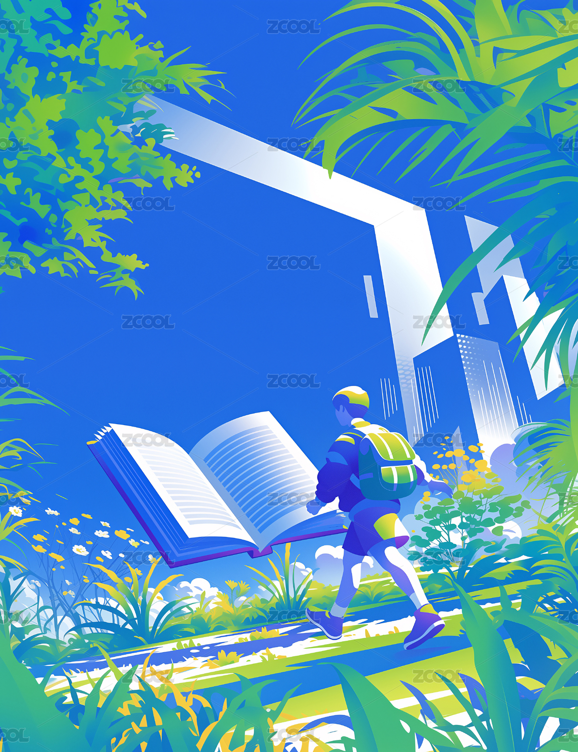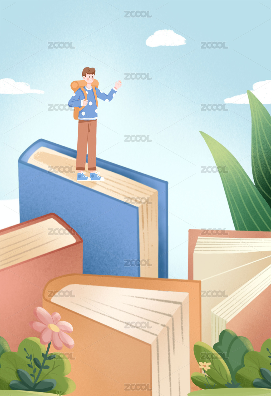 背着包的男性走向翻开的书本插画