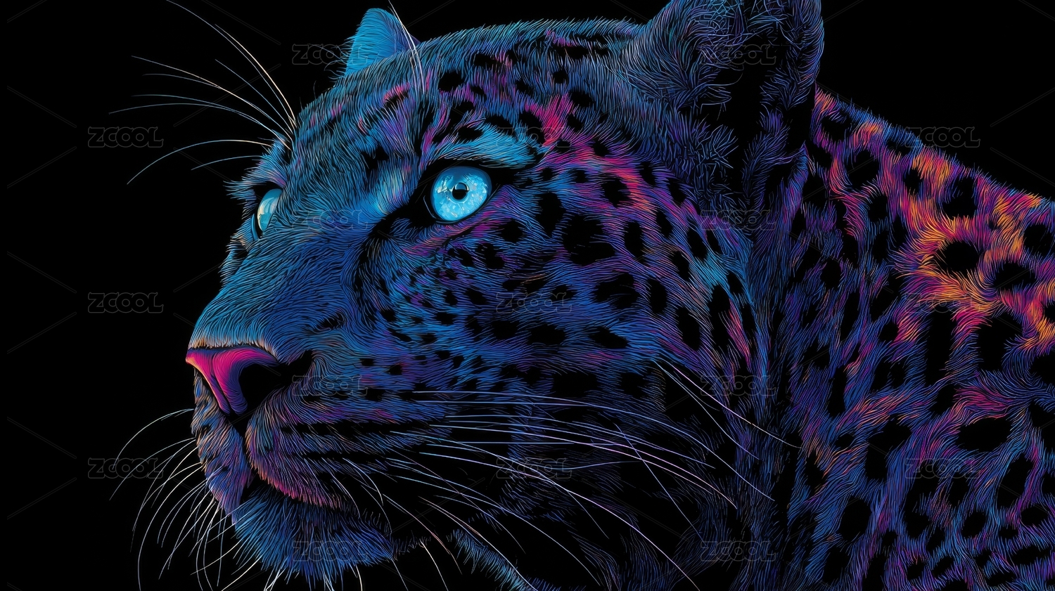 黑底黑背景荧光色豹子发光线条透视X光插画