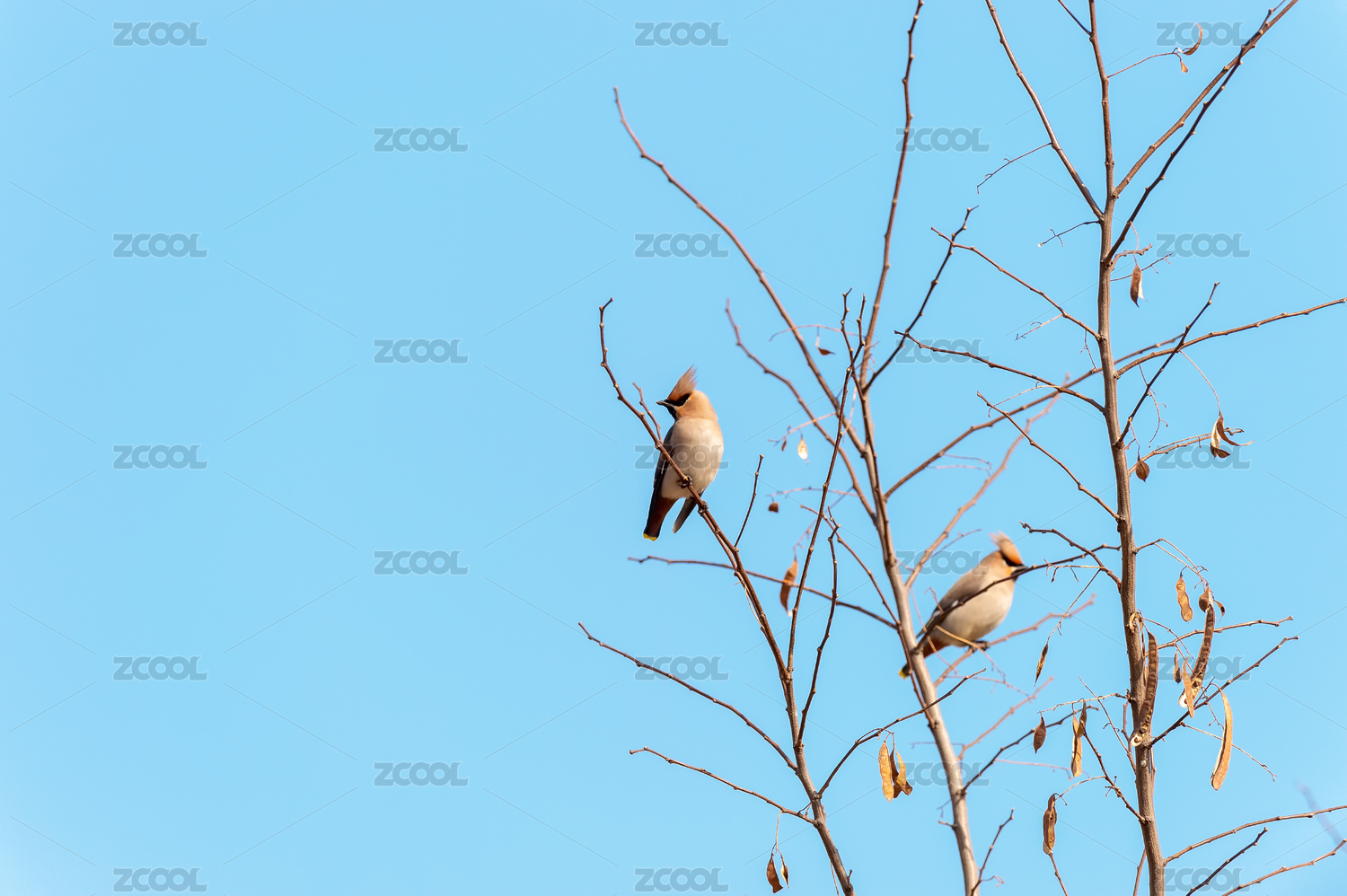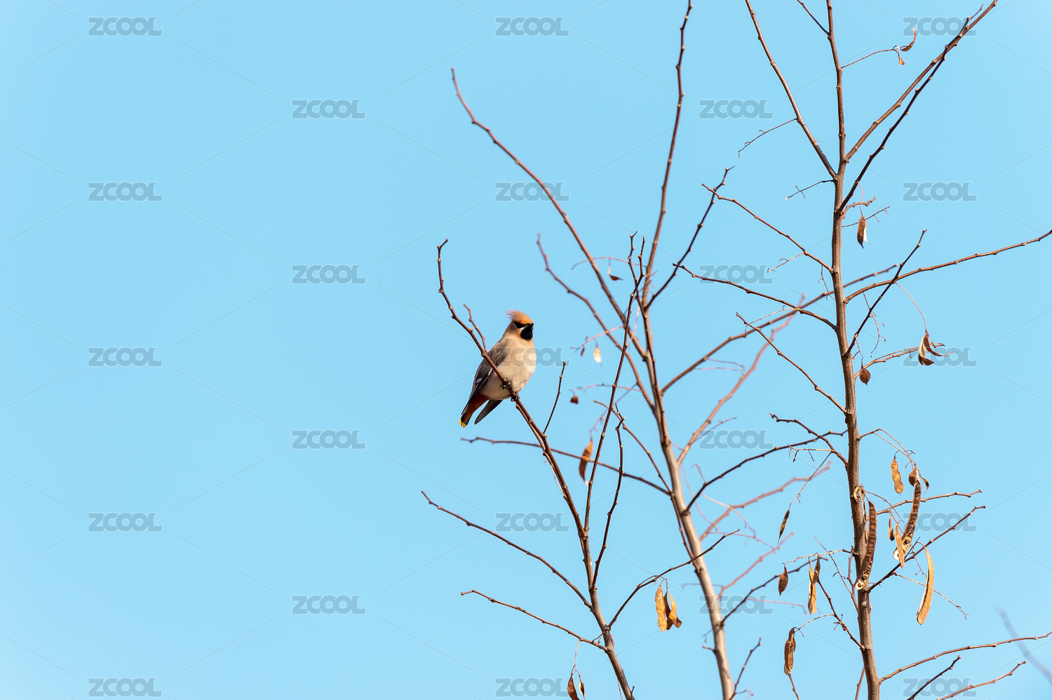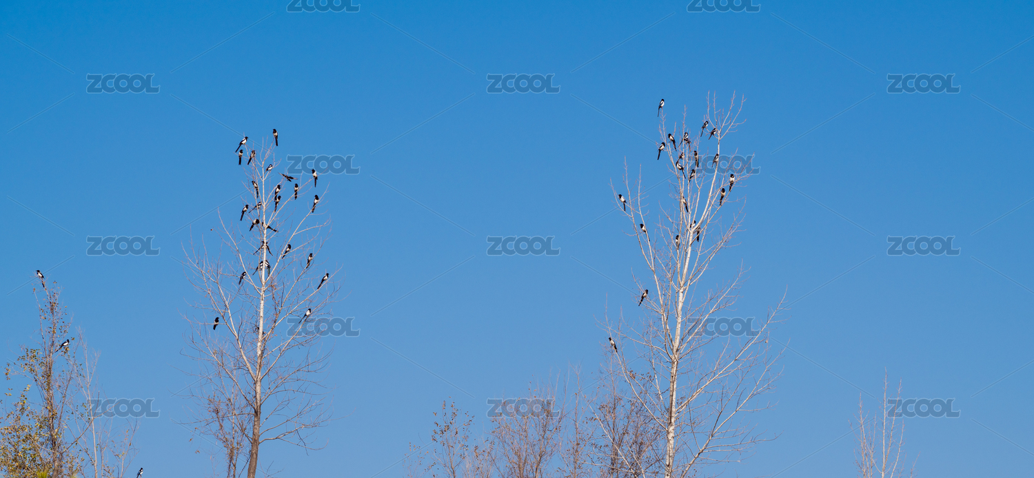 冬日里蓝色天空下杨树枝头上美丽的喜鹊