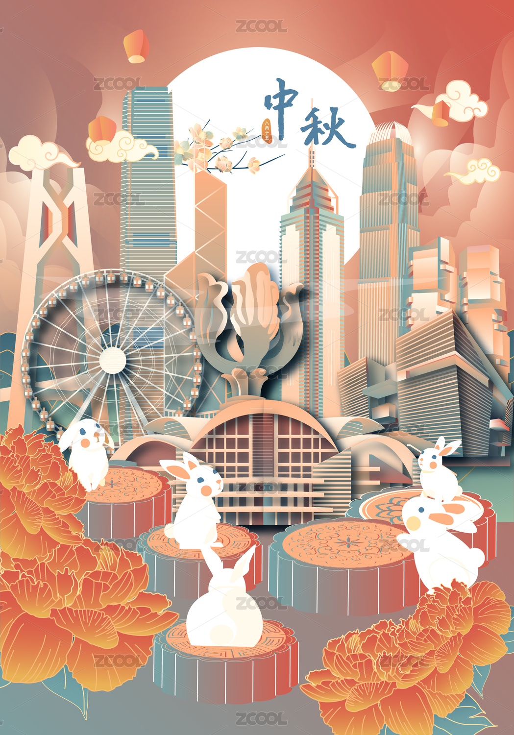 中秋节五只兔子站在月饼上看月亮矢量插画