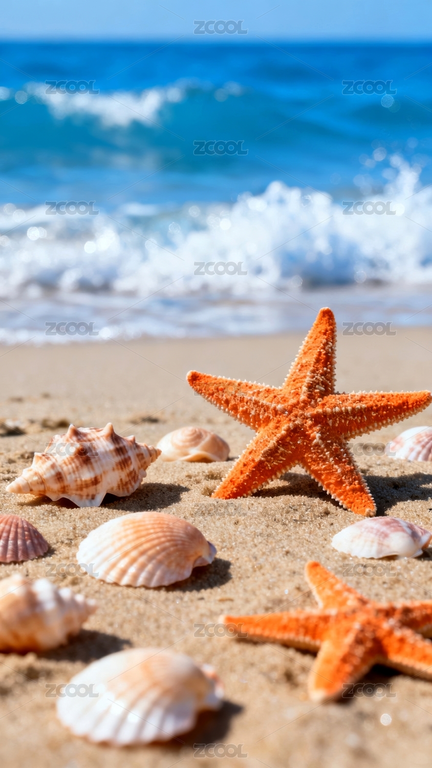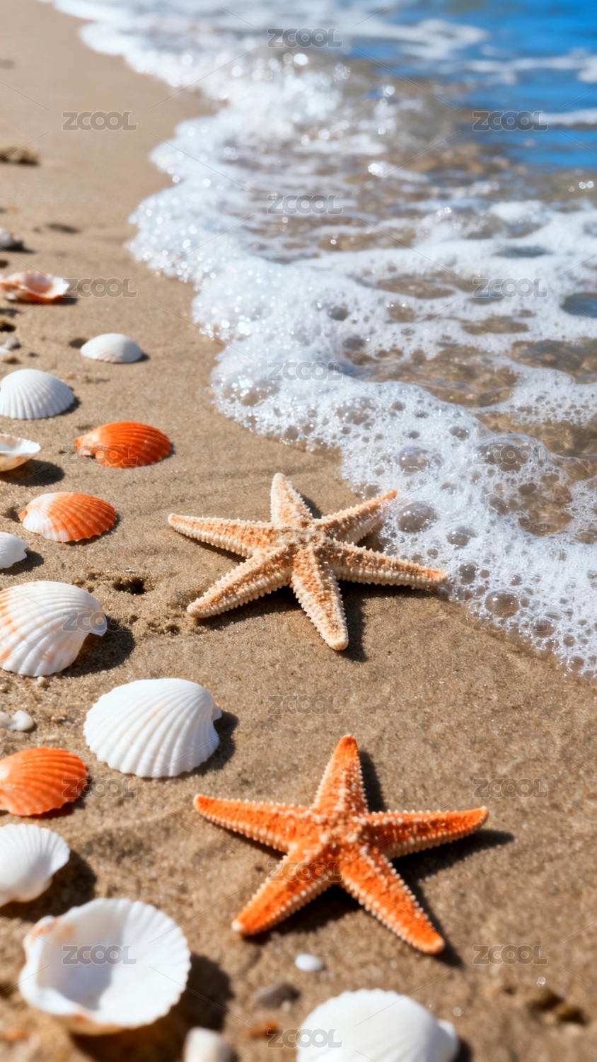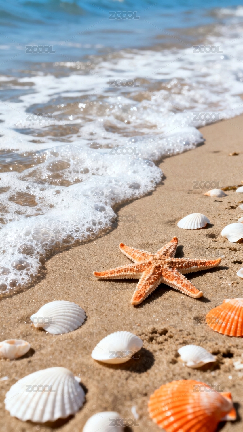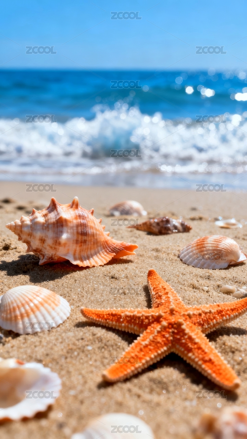 夏天,蓝天,白云,天空,晴朗,明亮,海水,海浪,贝壳,沙滩