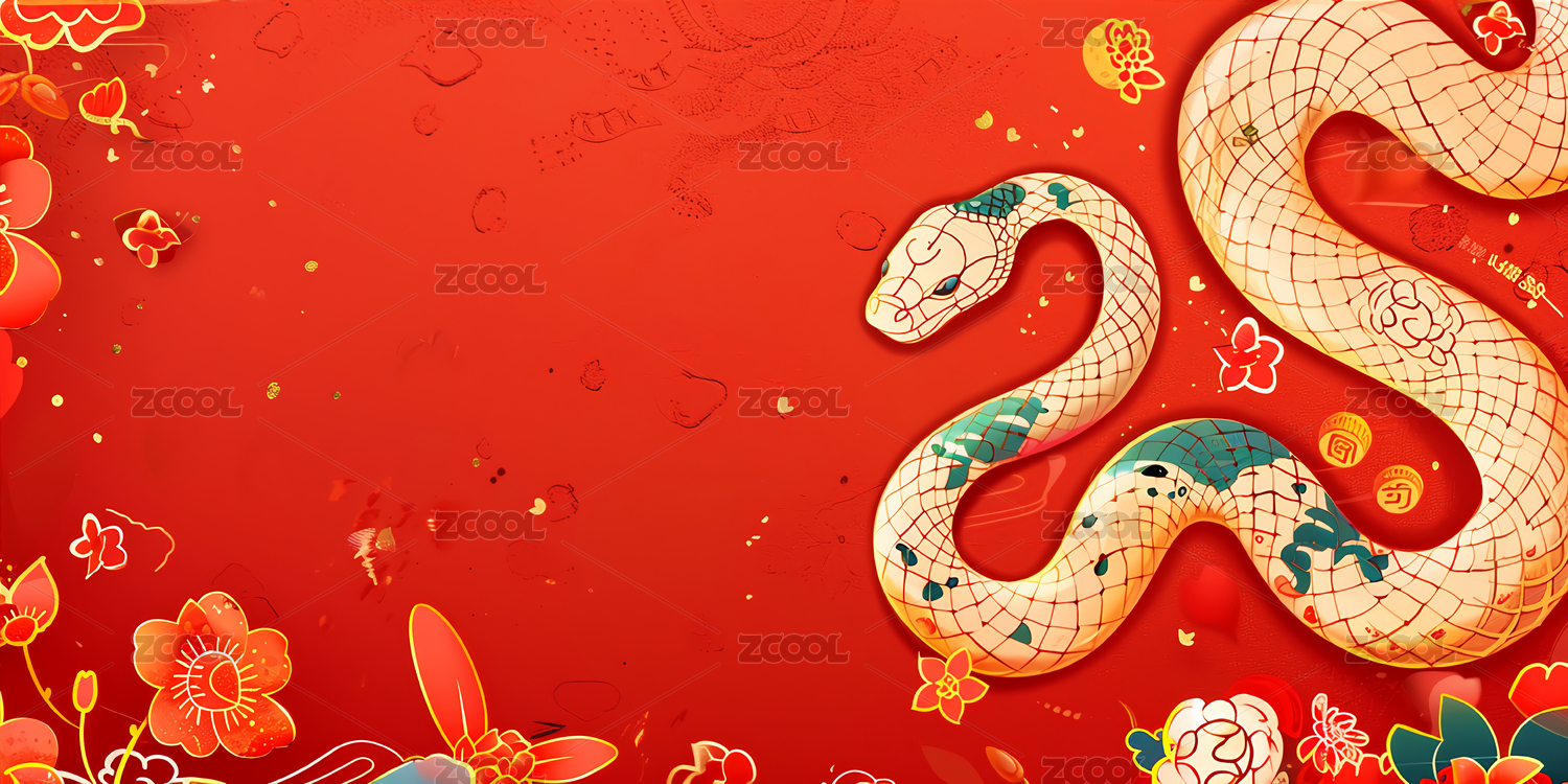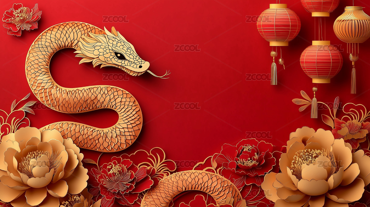春节背景设计剪纸风格金蛇和中式花纹祥云