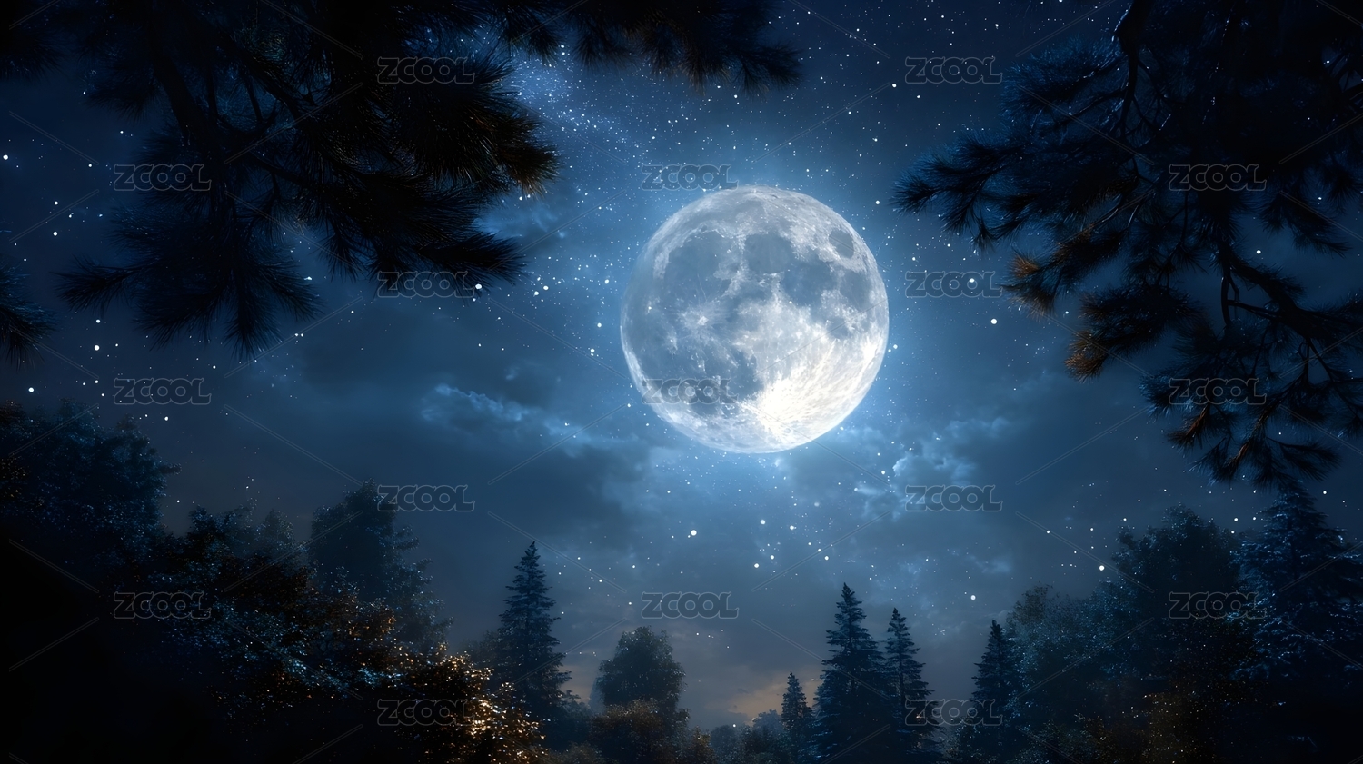 满月照亮夜晚森林