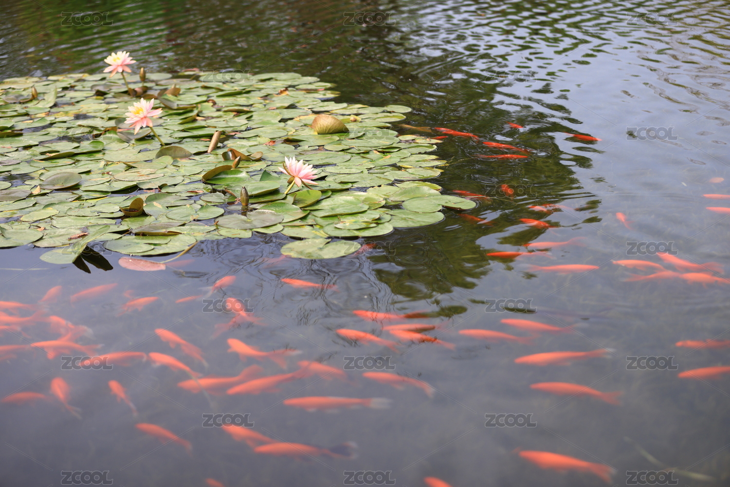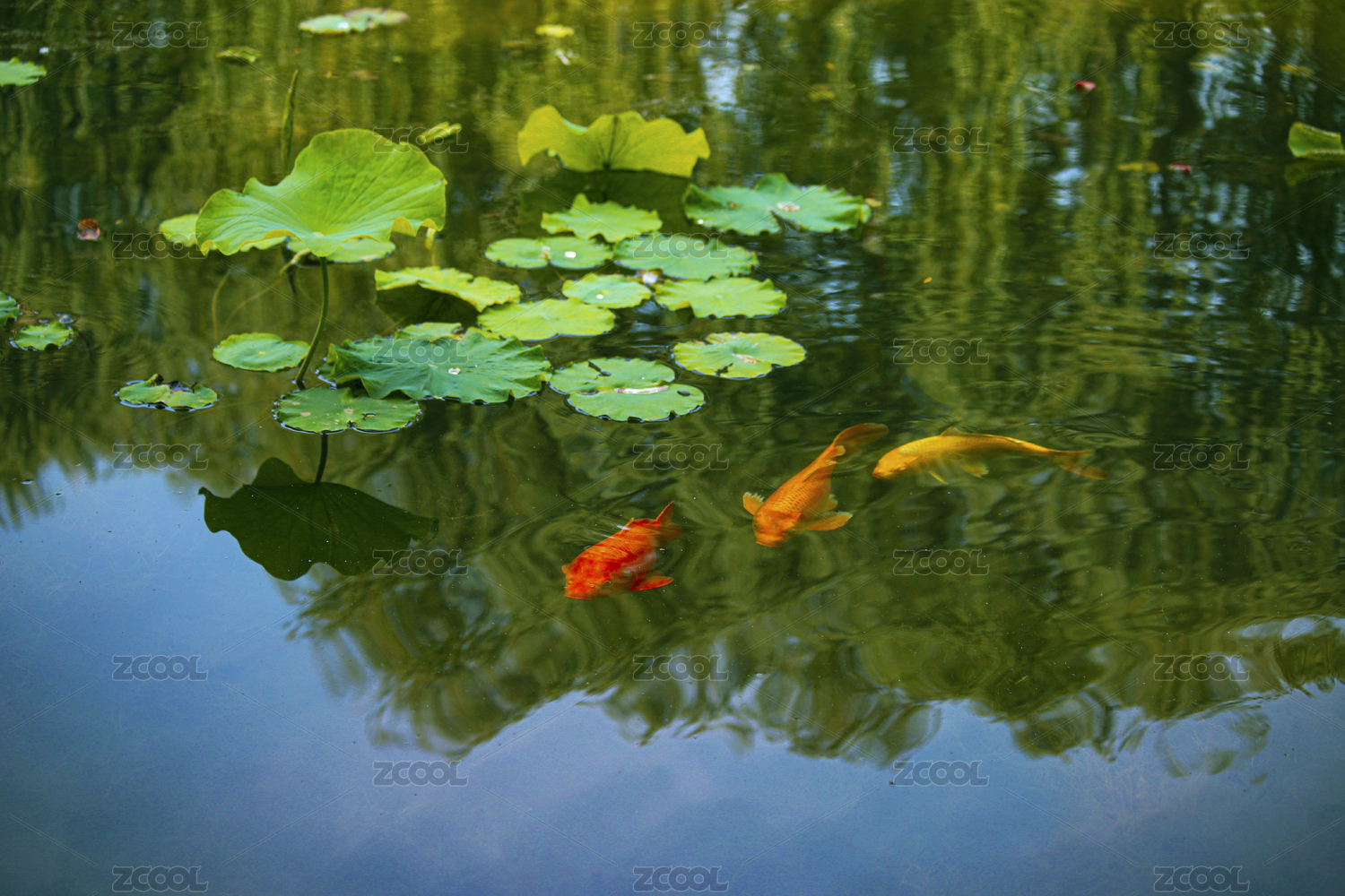 山西太原晋祠的池塘,金鱼游泳,荷叶花盛开