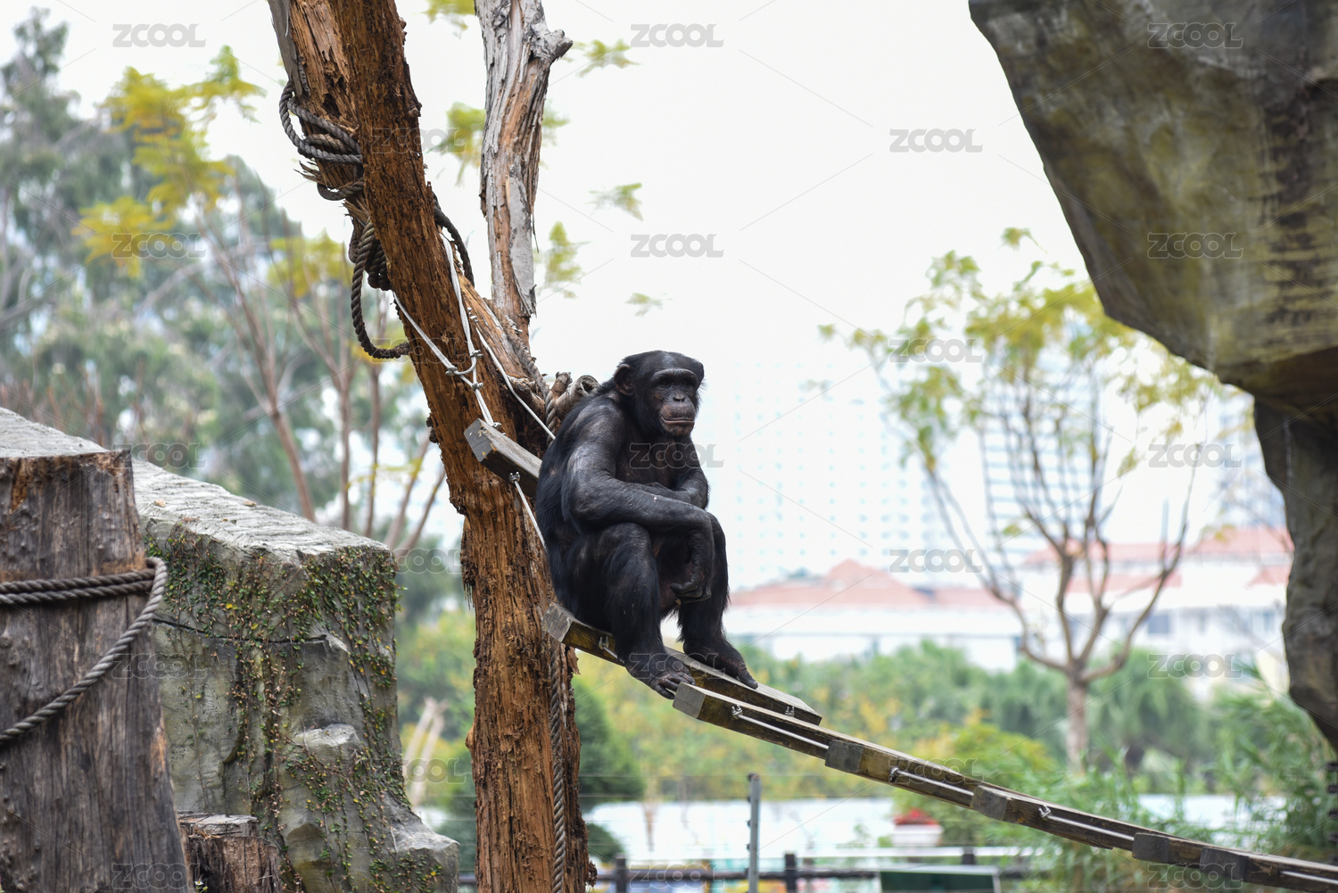 中国上海动物园草地上靠坐在石头上的黑猩猩
