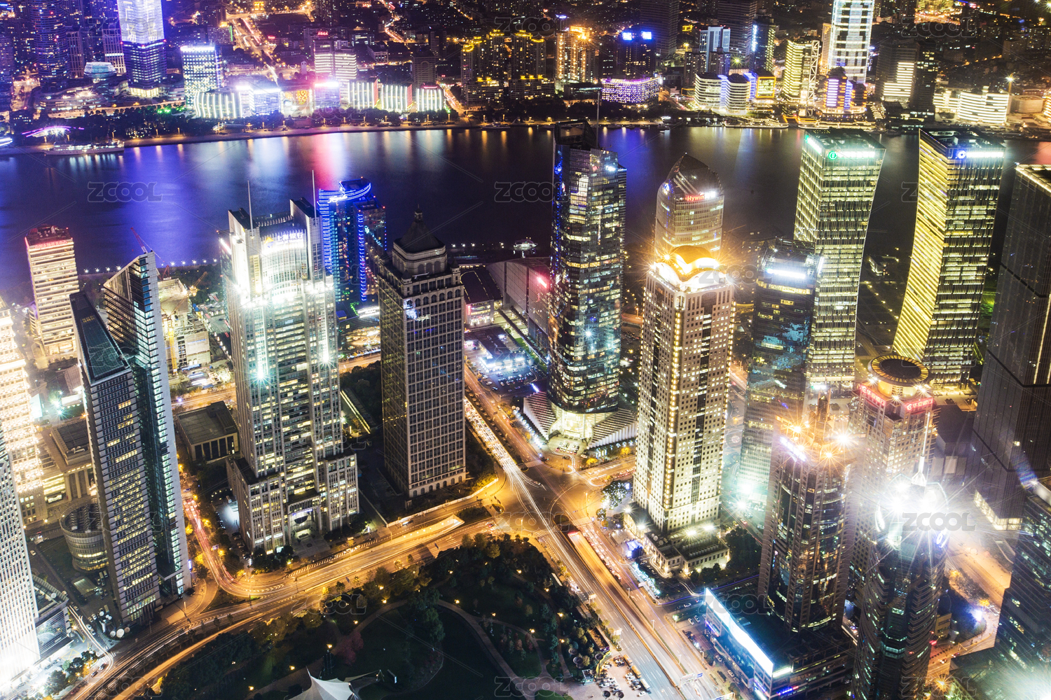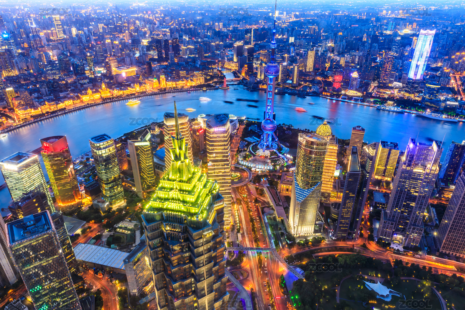 上海美丽的夜晚高角度城市天际线和霓虹灯建筑景观