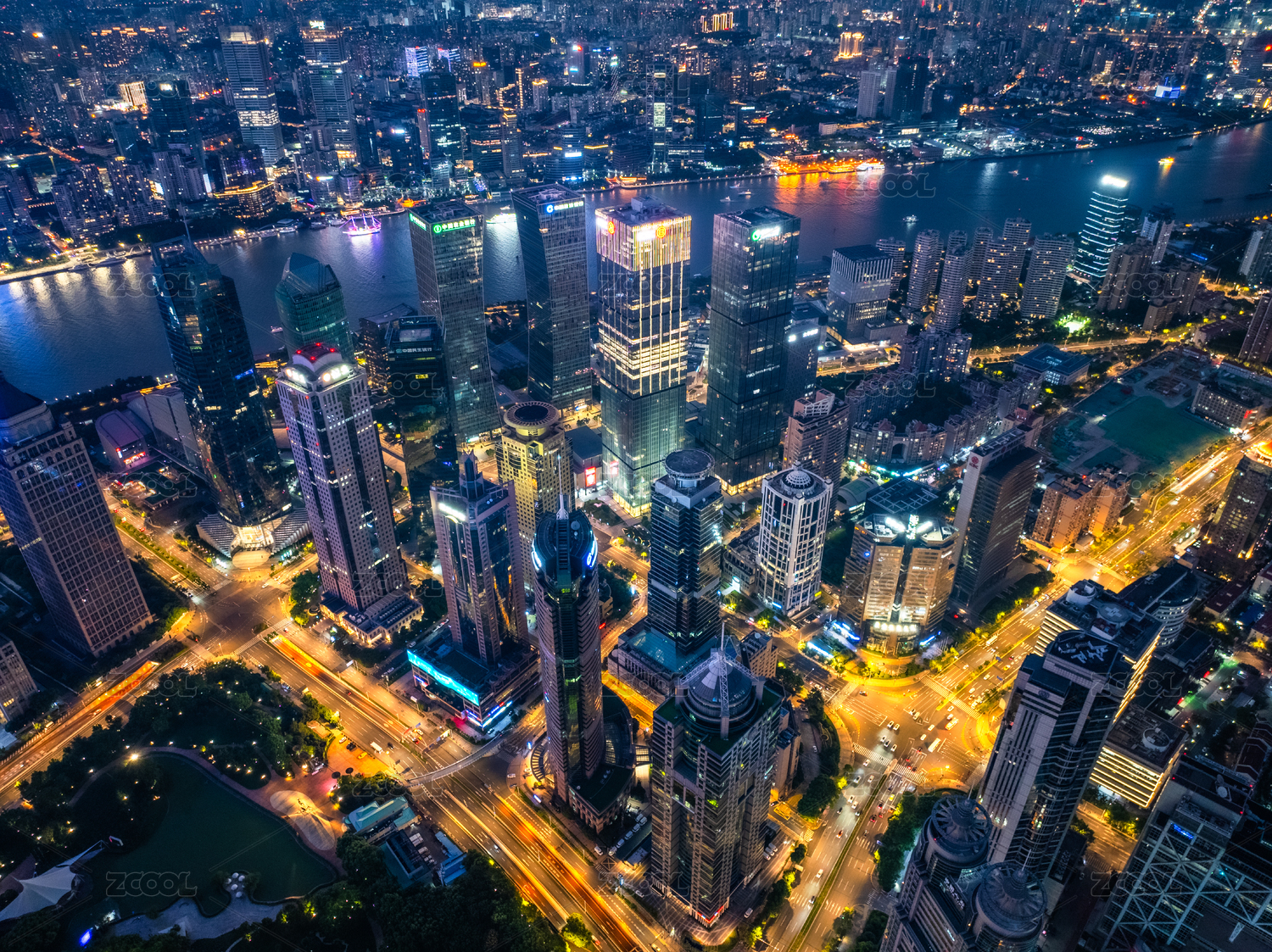 俯瞰航拍中国上海浦东陆家嘴CBD建筑夜景