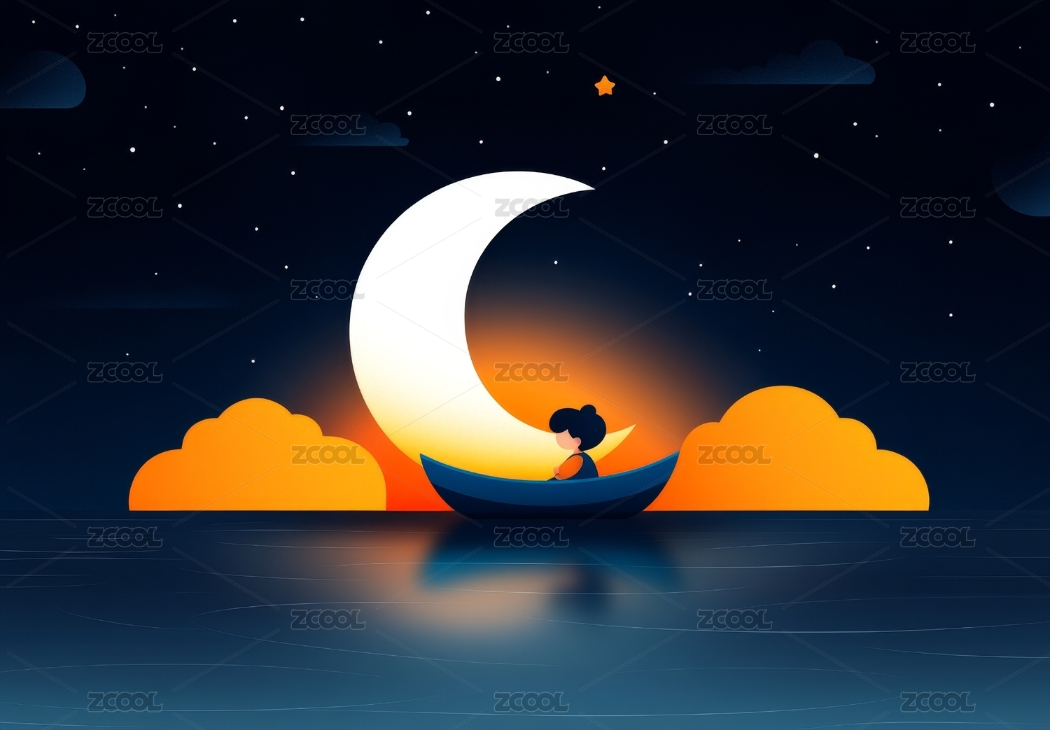 海洋,夜空,女孩,船,大鱼,蓝色,紫色,渐变插画,扁平,大海