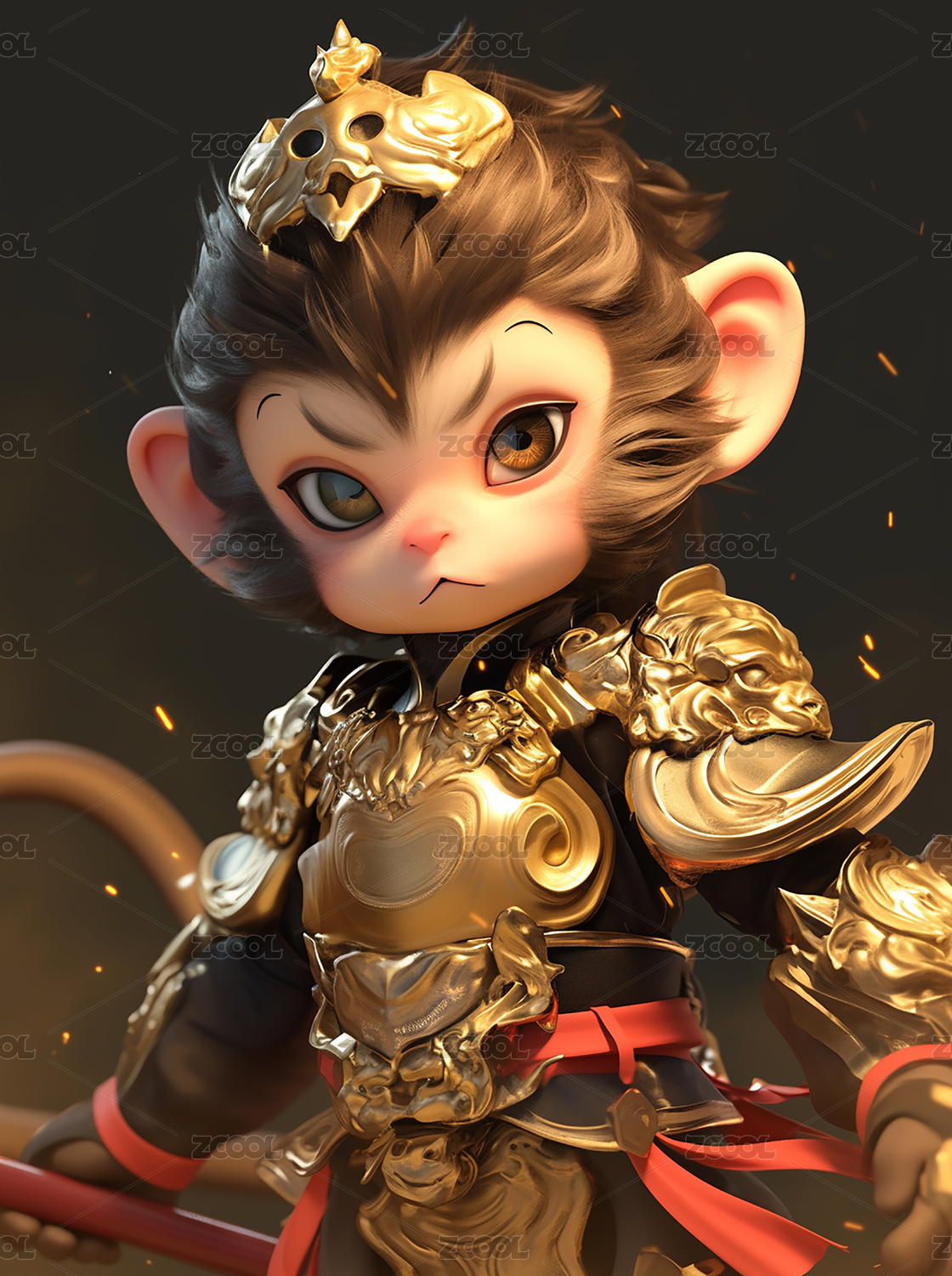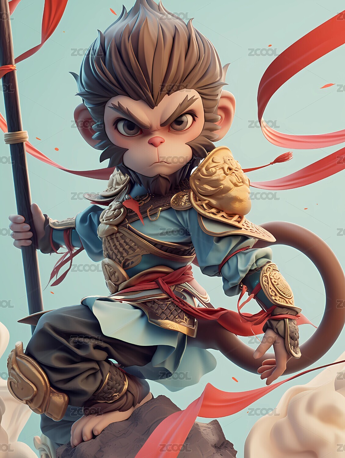 手拿金箍棒的可爱孙悟空3D卡通立体插画