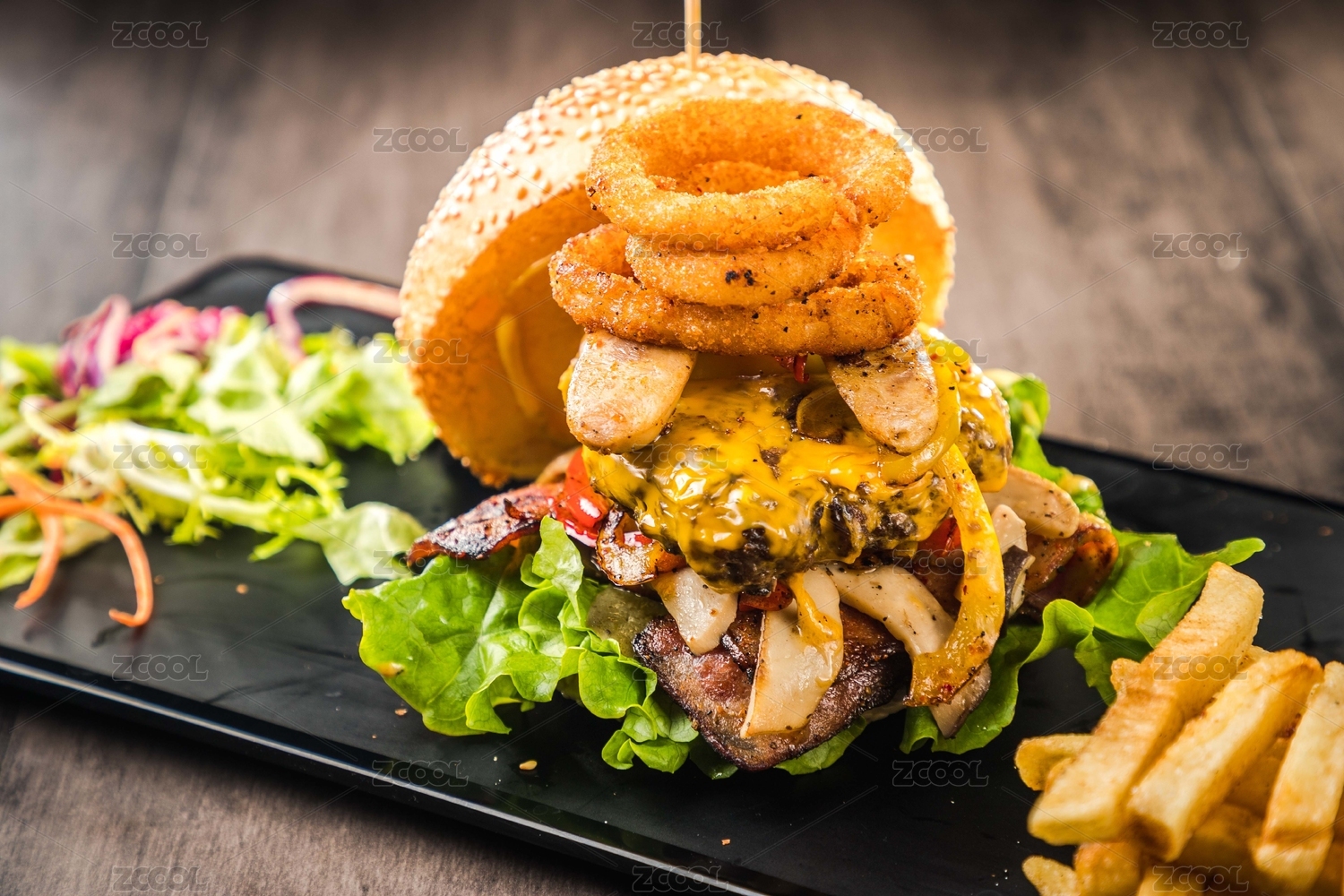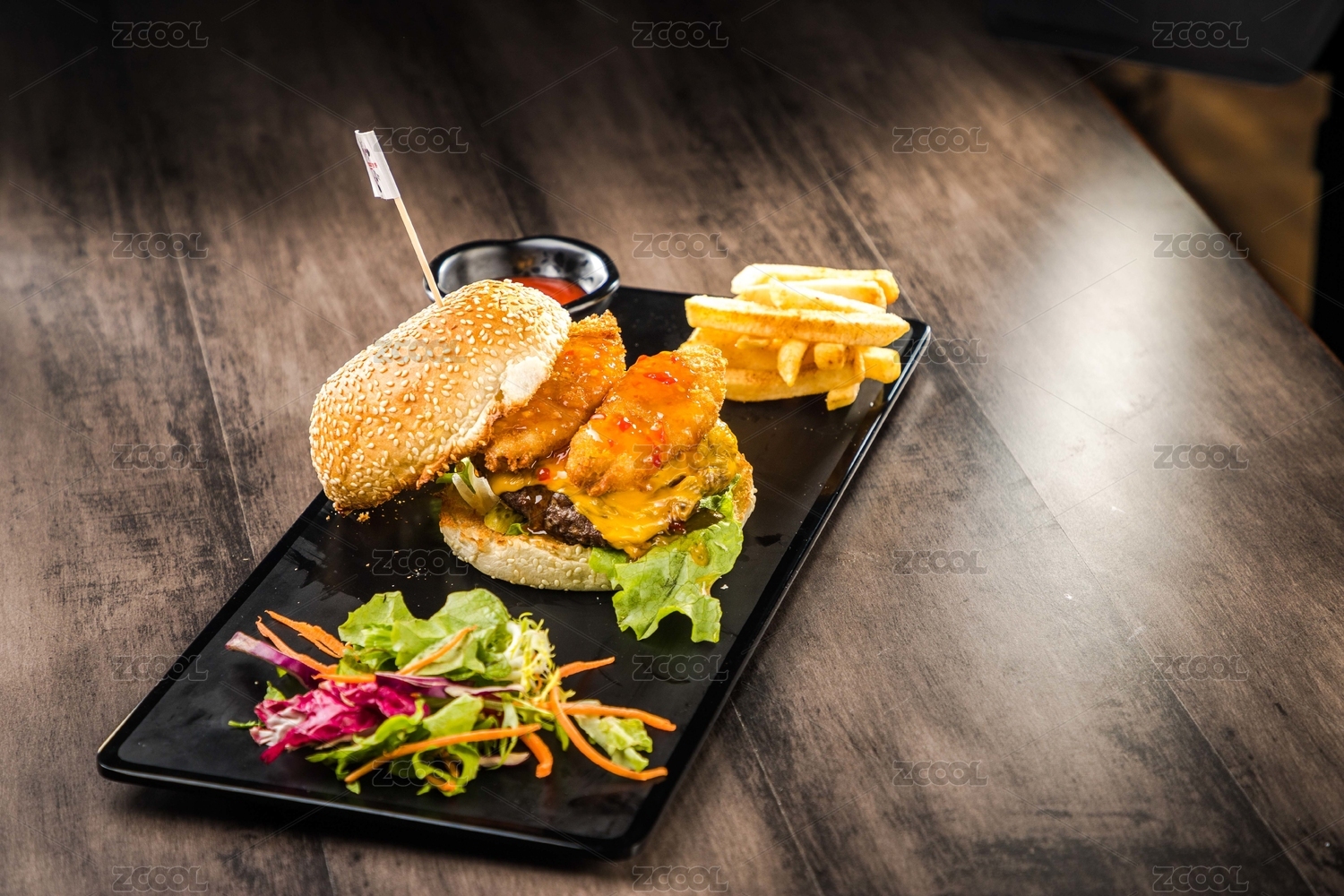 膳食,碟,汉堡,薯条,番茄酱,奶酪,融化,芝麻,面包,面包旗