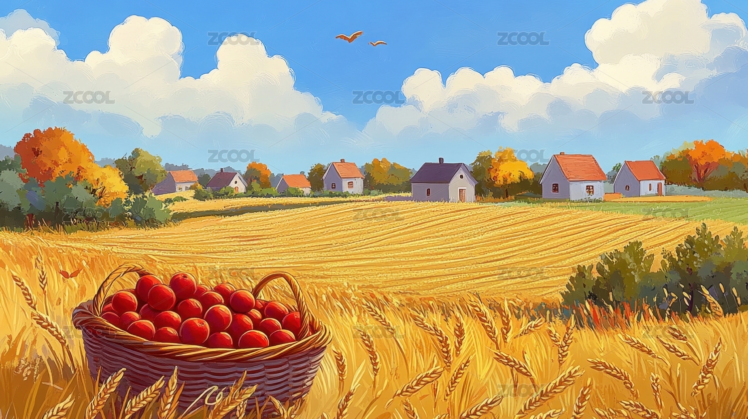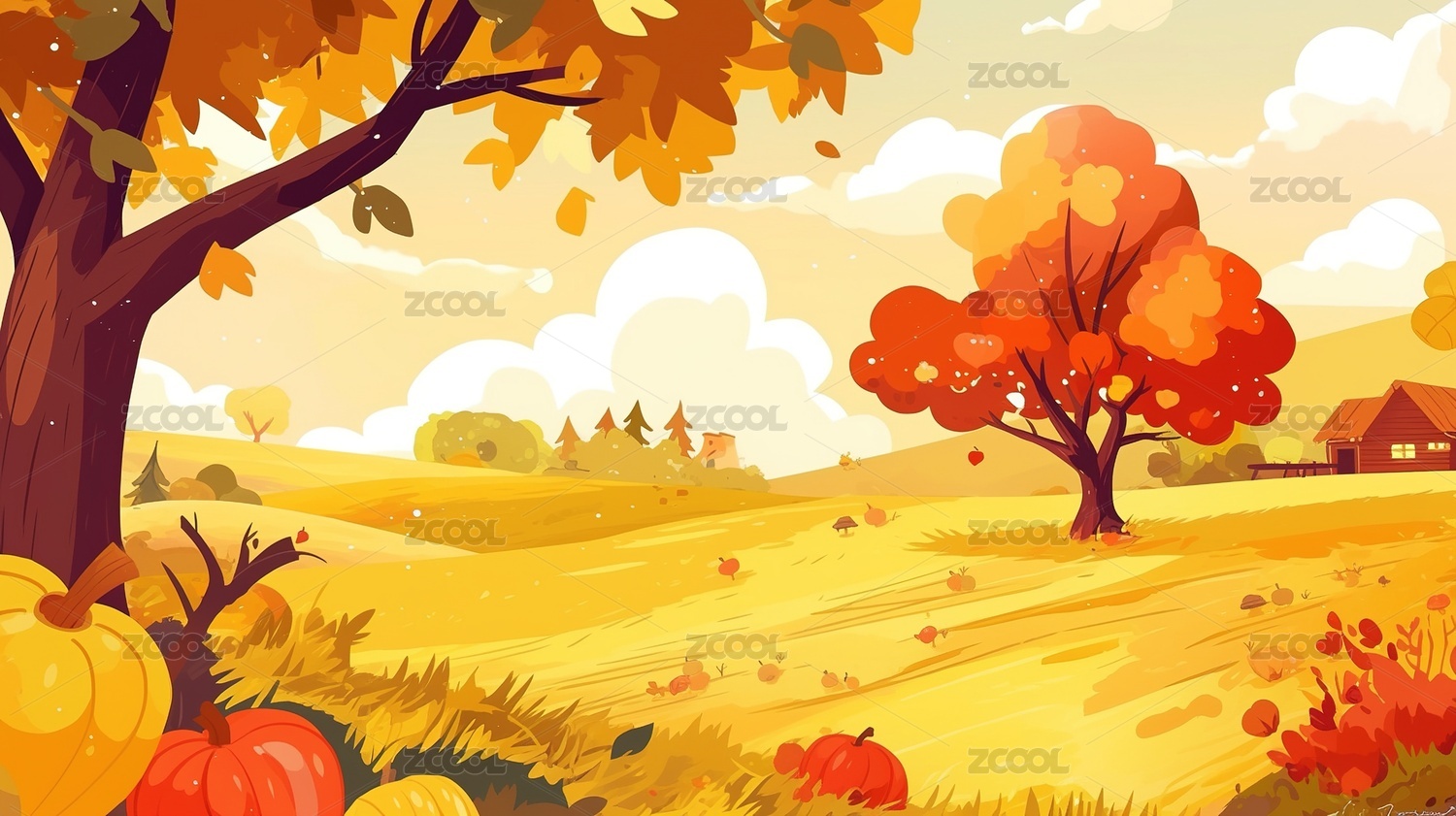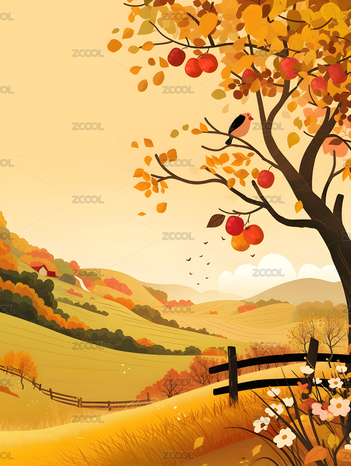 秋季晴天金黄色田野上长满果实的果树插画