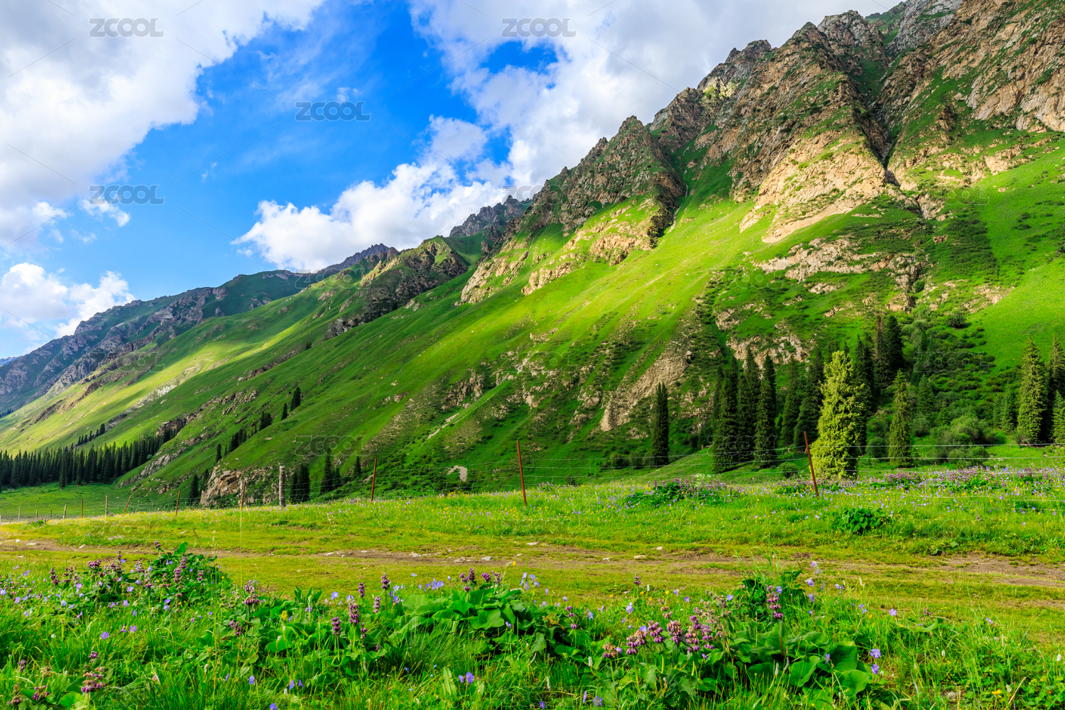 中国新疆下塔风景区雄伟的山脉和绿色的草原
