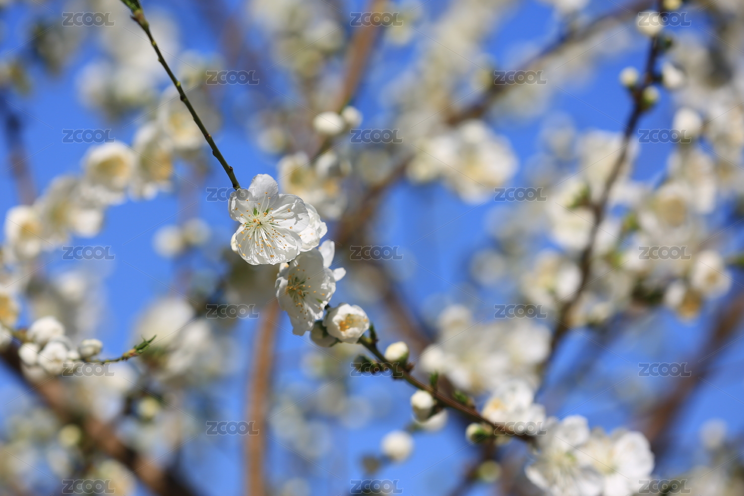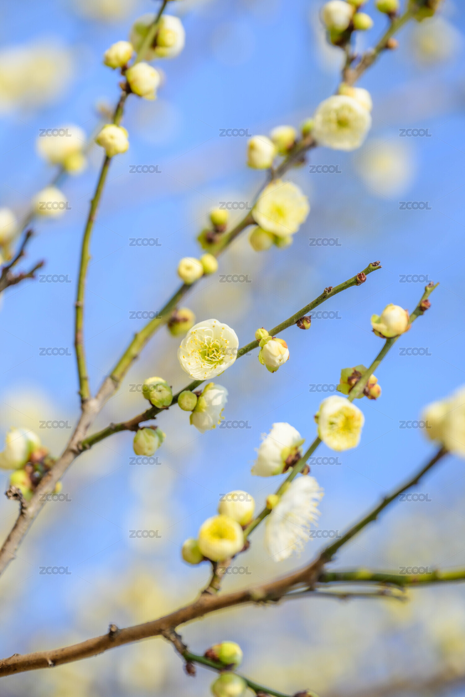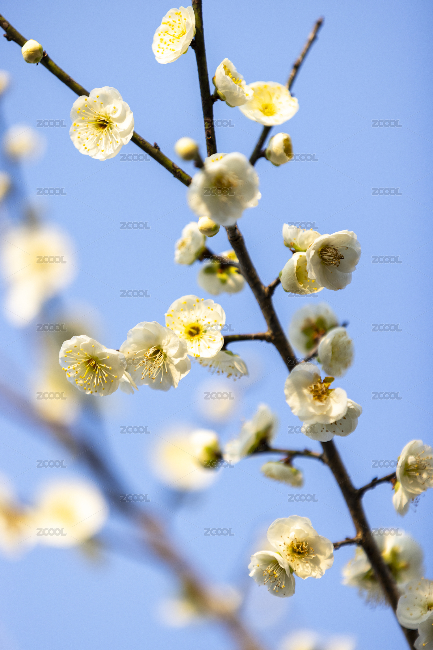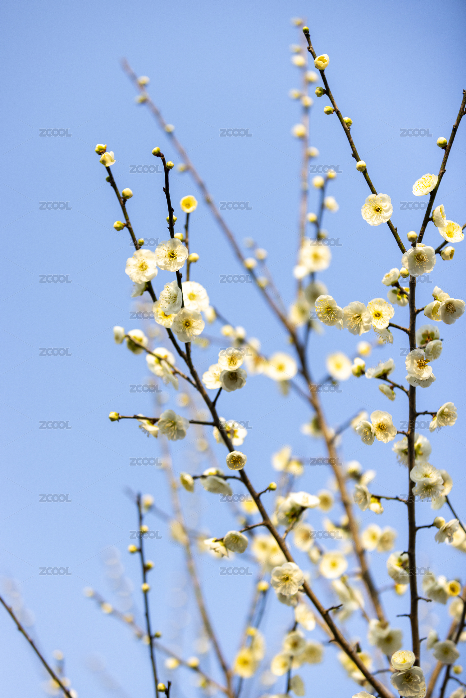 蓝色天空背景下的梅花白梅盛开特写